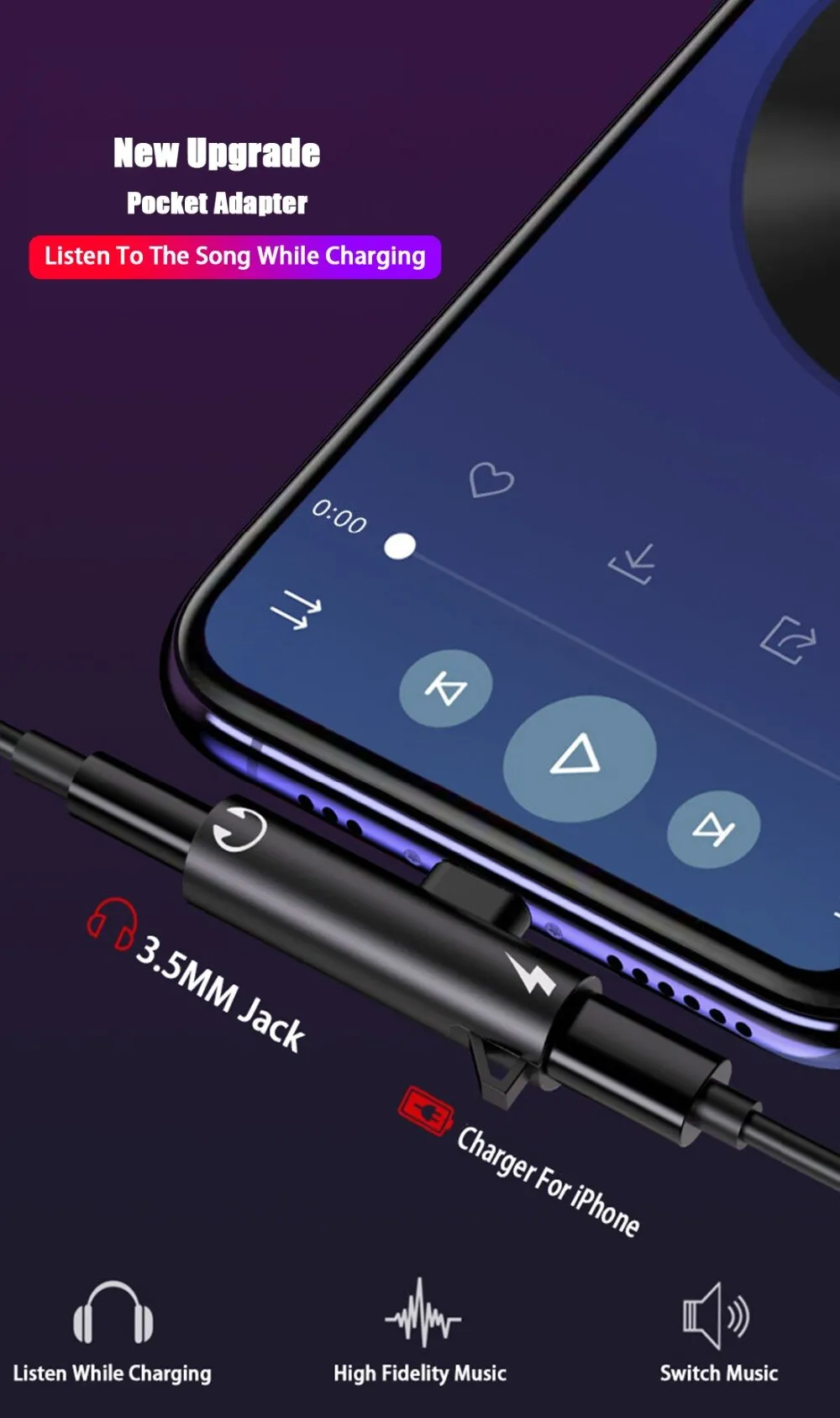 Enjoy music and charge your device at the same time with this Lightning to AUX + Charging Adapter, designed specifically for iPhone users. This compact, stylish accessory features dual functionality: a 3.5mm headphone jack and a Lightning charging port, all in one sleek unit. Whether you're listening to music, watching videos, or taking calls, this adapter ensures seamless performance without interruption.