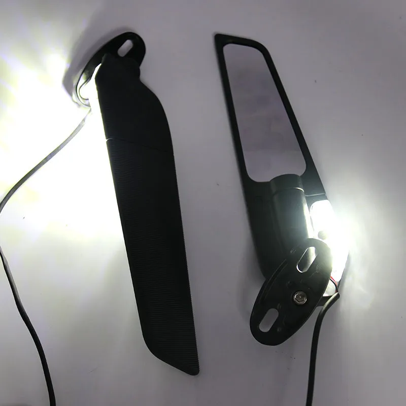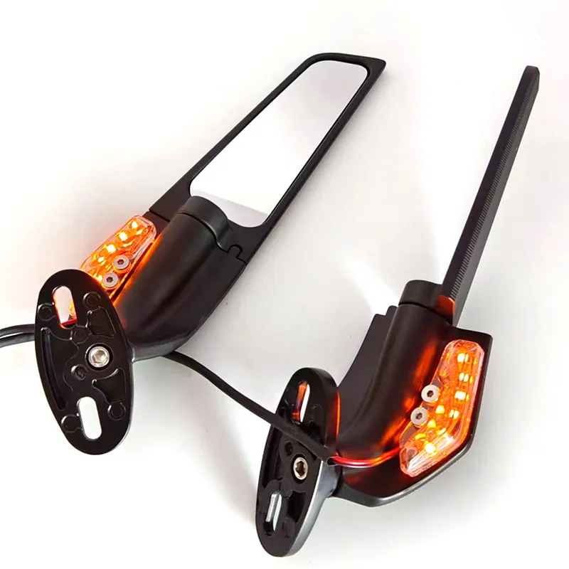 Featuring yellow LED running lights for added visibility in low-light conditions, these mirrors act as both a reflector and a stylish upgrade. The white convex glass provides a wide-angle view, reducing blind spots and improving road awareness while maintaining a sleek aerodynamic profile.
