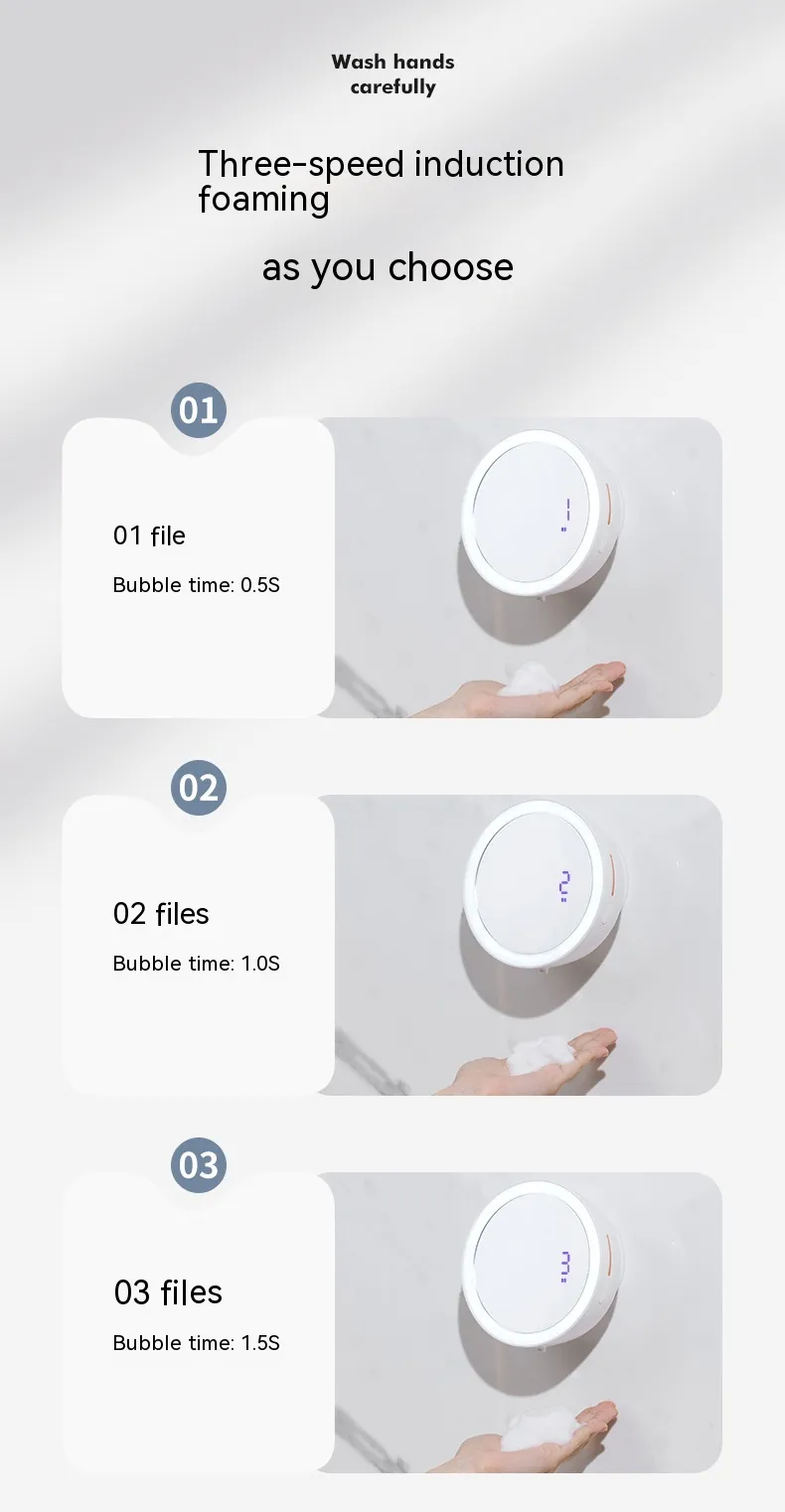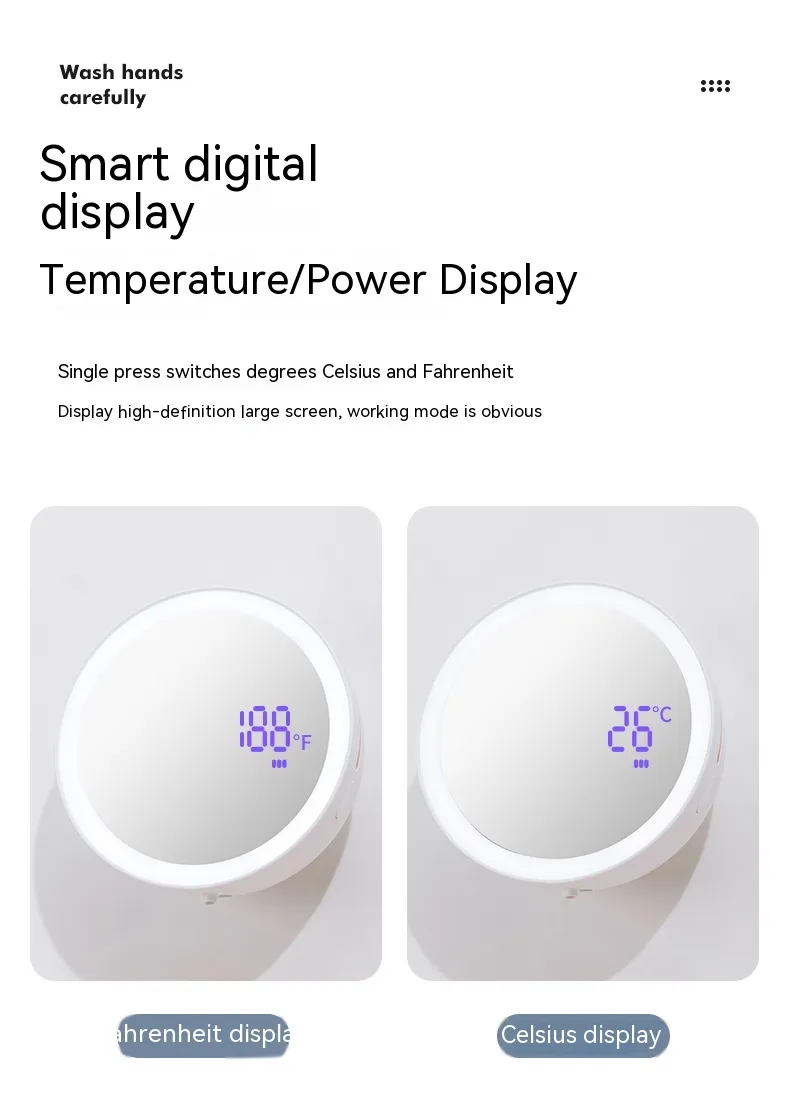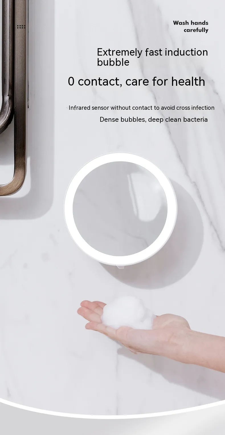 Integrated with a 48-fill LED digital tube display light source, the beauty mirror provides bright, natural lighting at 9000K, perfect for makeup application or phone video calls. Powered by a rechargeable 1500mAh battery via USB, the device combines practical soap dispensing with modern design and functionality.