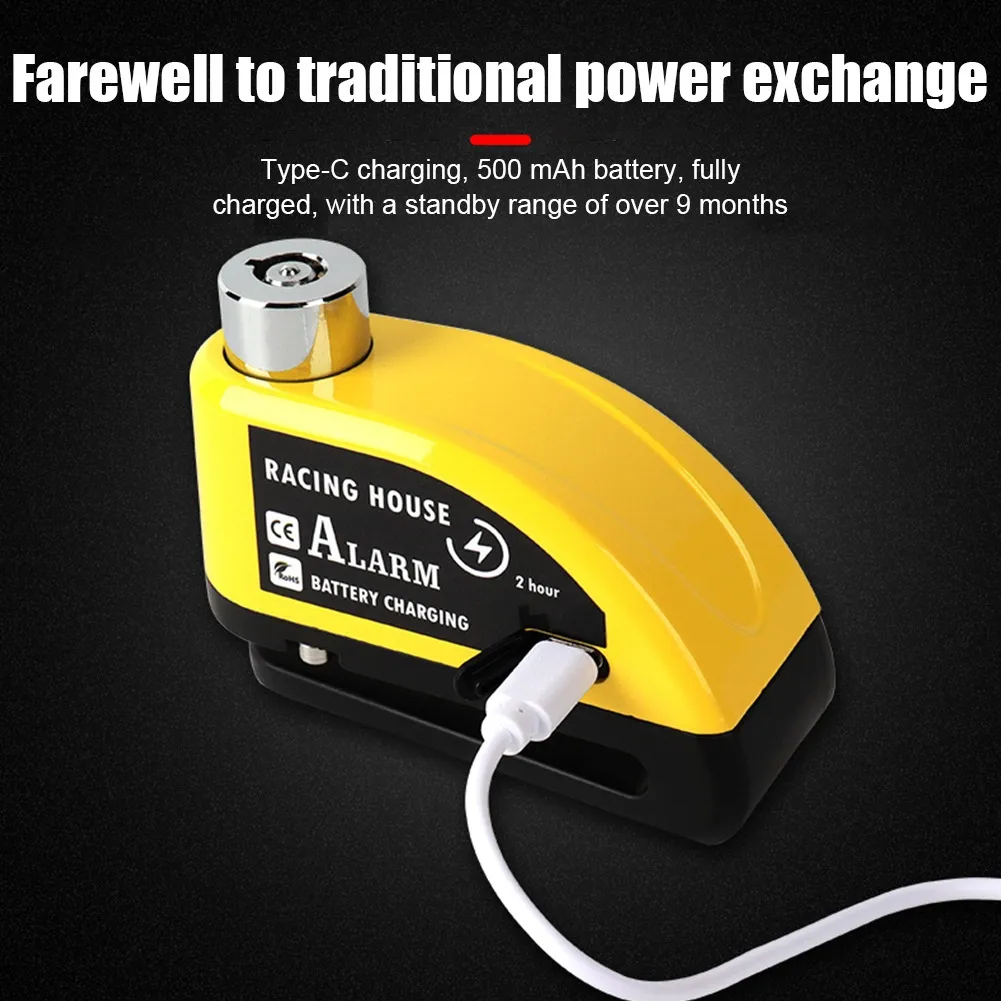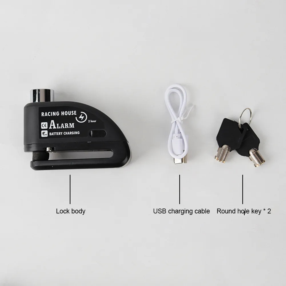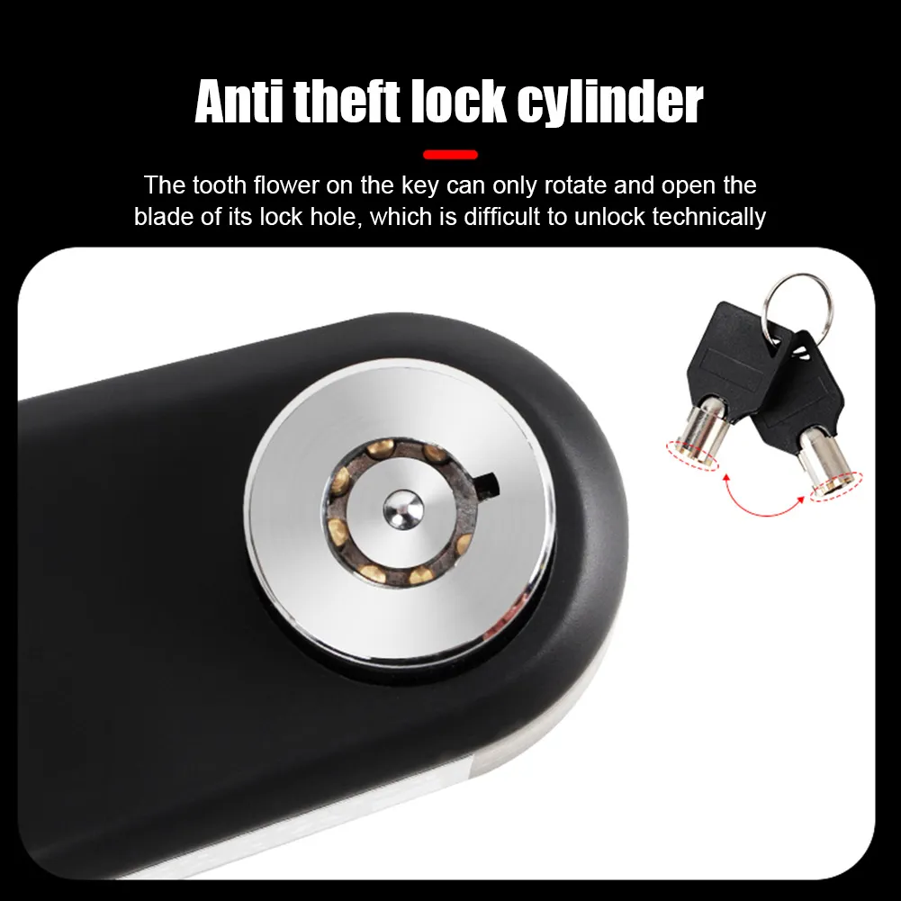Featuring a built-in waterproof alarm system, the lock automatically triggers a loud alert when tampered with, instantly scaring off potential thieves. Compact in size at 9.5 Γ 3.7 Γ 6.9 cm, it is portable, easy to use, and ideal for both daily commutes and long-term parking. The disc brake design ensures a tight and reliable fit, preventing unauthorized wheel movement.