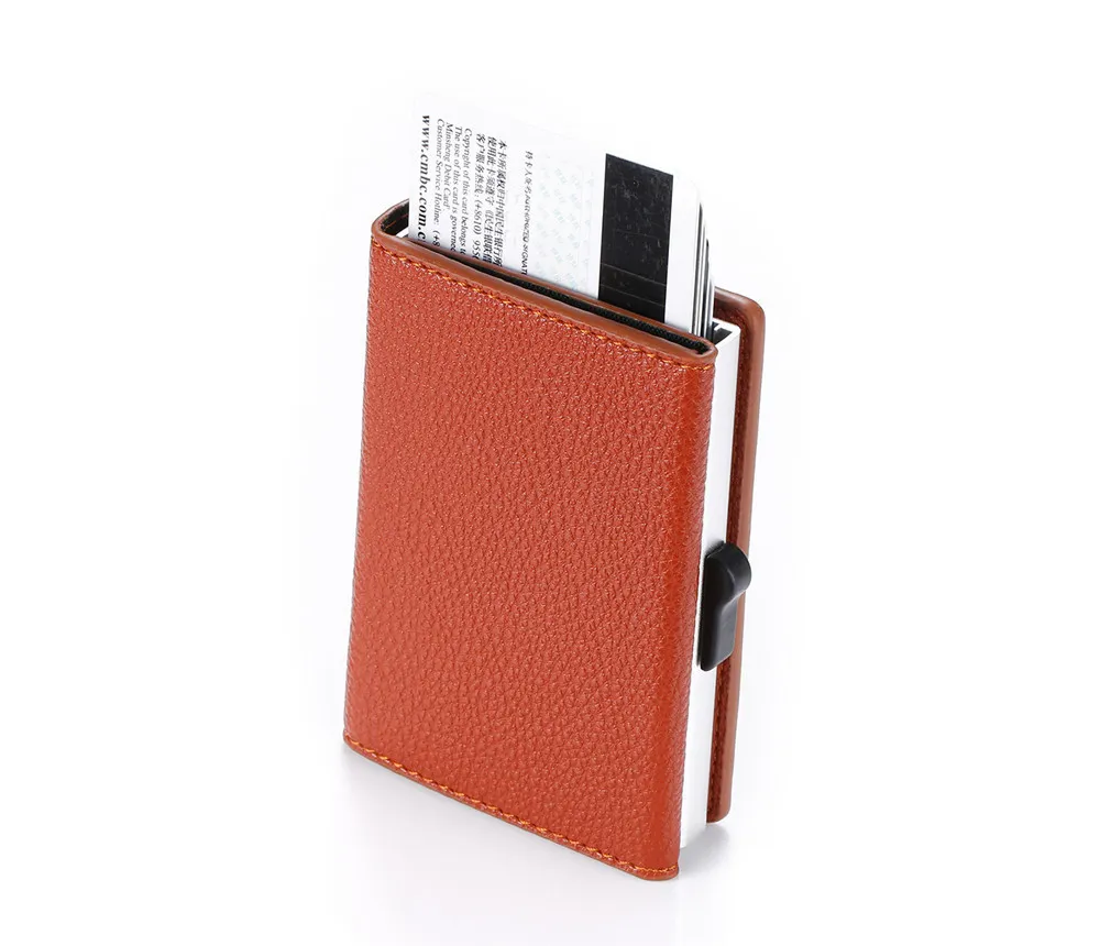 Upgrade your wallet game with this sleek and compact metal card holder featuring an automatic eject function. Crafted with a premium PU leather exterior and a sturdy internal metal structure, this credit card case ensures durability and modern appeal in one practical design. The plain pattern and minimal style make it a sophisticated choice for both casual and professional settings.