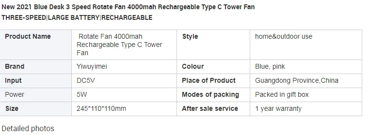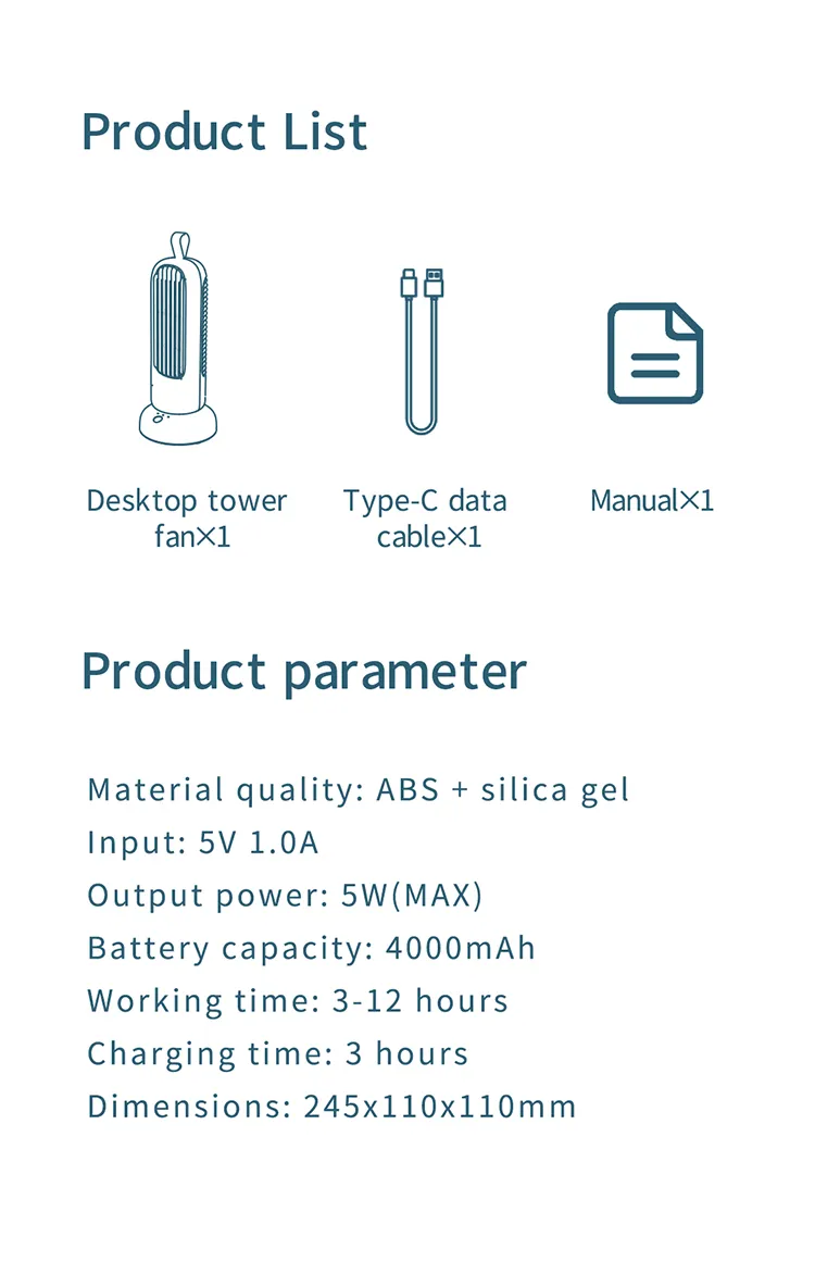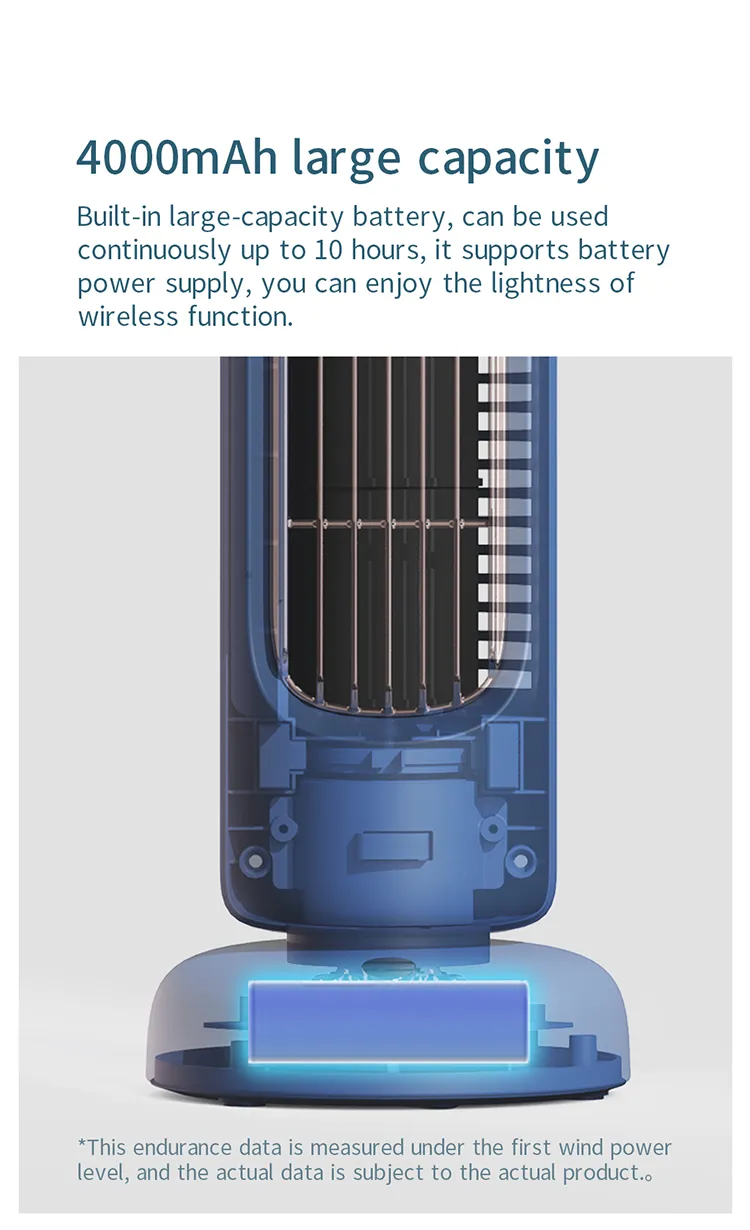 Equipped with a three-gear speed regulating system, this fan lets you adjust airflow to your comfort. With a rated power of 5W, noise levels below 40dB, and USB power supply, it offers quiet and efficient operation. The built-in 4000mAh battery allows portable use without constant plugging, perfect for moving around your room or workspace.