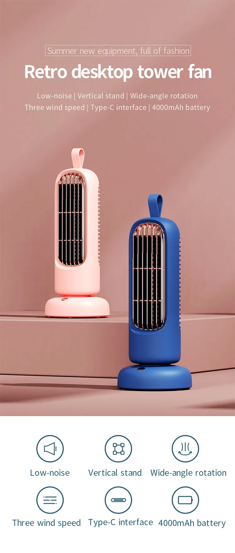 Available in stylish Royal Blue and Begonia Powder colors, this mini tower fan combines functionality with retro aesthetics. Lightweight at 750g and compact in size (12 Γ 16 Γ 23 cm), it is easy to place on desktops, bedside tables, or shelves while delivering efficient cooling wherever you need it.