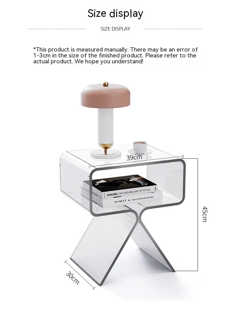 Crafted from high-quality acrylic, the Minimalist Transparent Acrylic Side Table is lightweight yet durable. It comes in two stylish color options: transparent white and transparent black, allowing it to seamlessly blend into any room decor. Measuring 393045 cm, it provides the perfect size for holding drinks, snacks, books, or decorative items without taking up too much space.