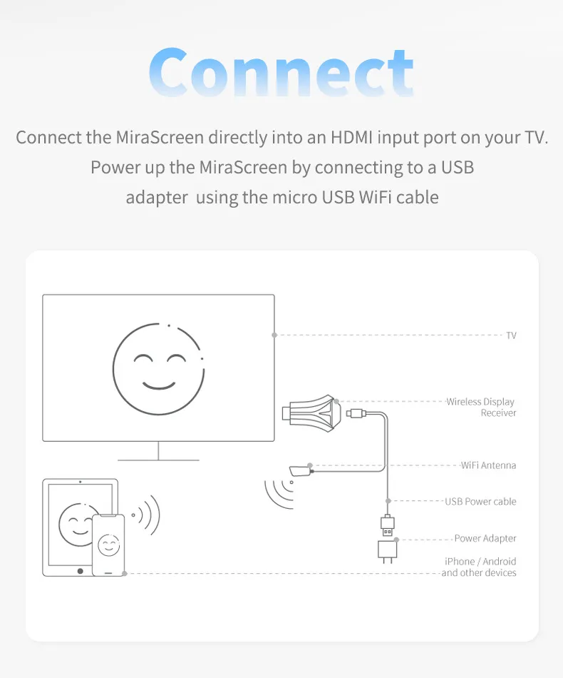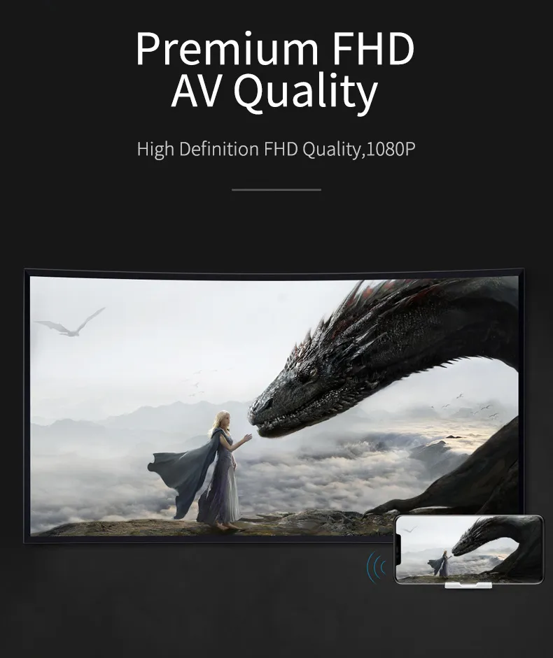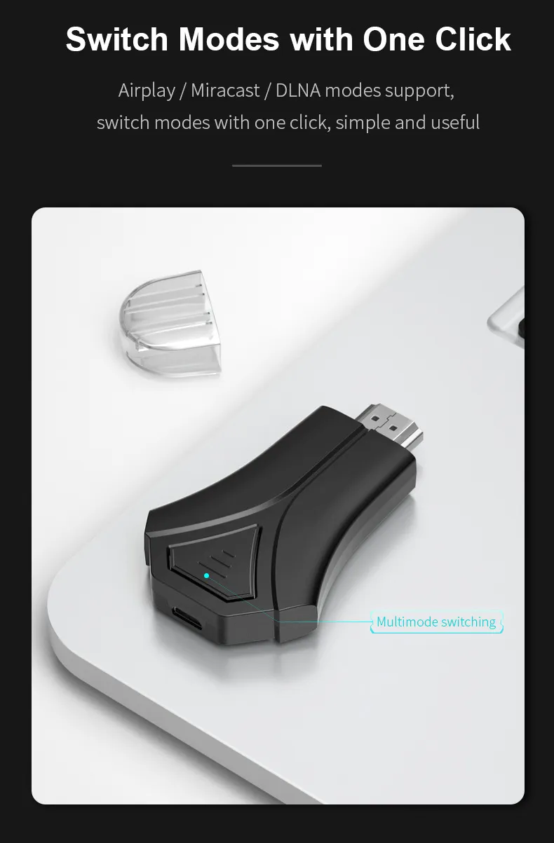 Equipped with the Am8268 processor, this dongle supports full HD 1080p resolution, offering crystal-clear visuals for movies, slideshows, and web browsing. Compatible with popular formats like MP4, MKV, RMVB, AVI, and FLV, it also supports a wide range of audio files such as MP3, WAV, FLAC, and APE. Simply connect it to an HDMI port, power it with the included USB cable, and start screen casting from your phone using WiFi.