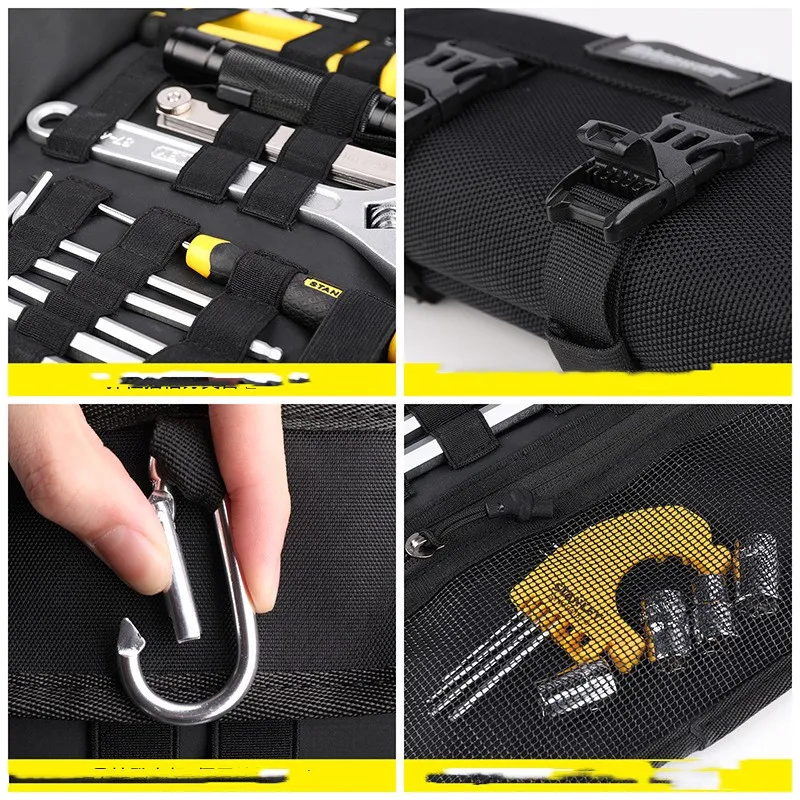 Additional features include a climbing buckle for easy hanging and two Velcro straps for secure attachment to your motorcycle or backpack. Whether you're prepping for an adventure or need an everyday utility pouch, this kit ensures you're always prepared—with tools securely in place and easily accessible.
