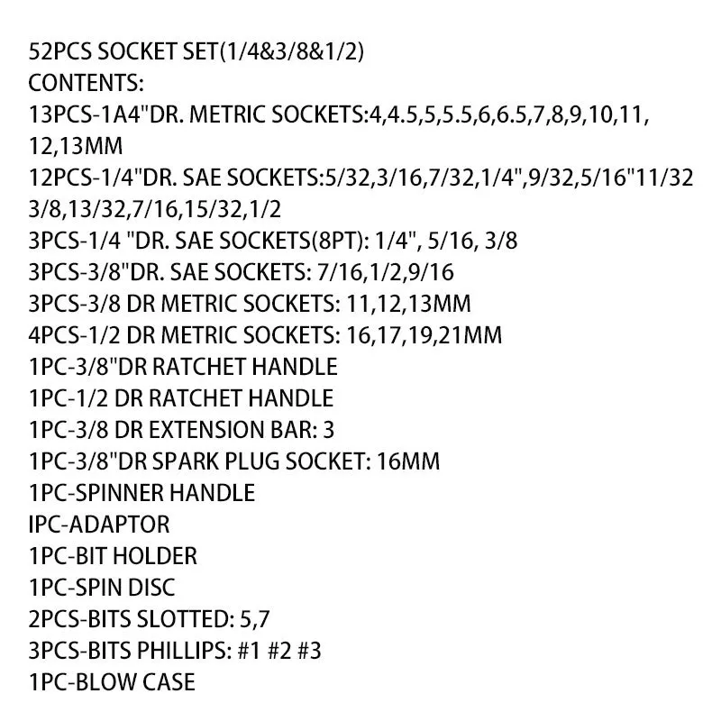 Upgrade your toolkit with this multi-size 52-piece socket wrench set, specially designed for automobile repair, garage maintenance, and heavy-duty tasks. Made from durable carbon steel, each piece offers superior strength, ensuring long-lasting performance for both professional mechanics and DIY car enthusiasts.