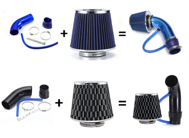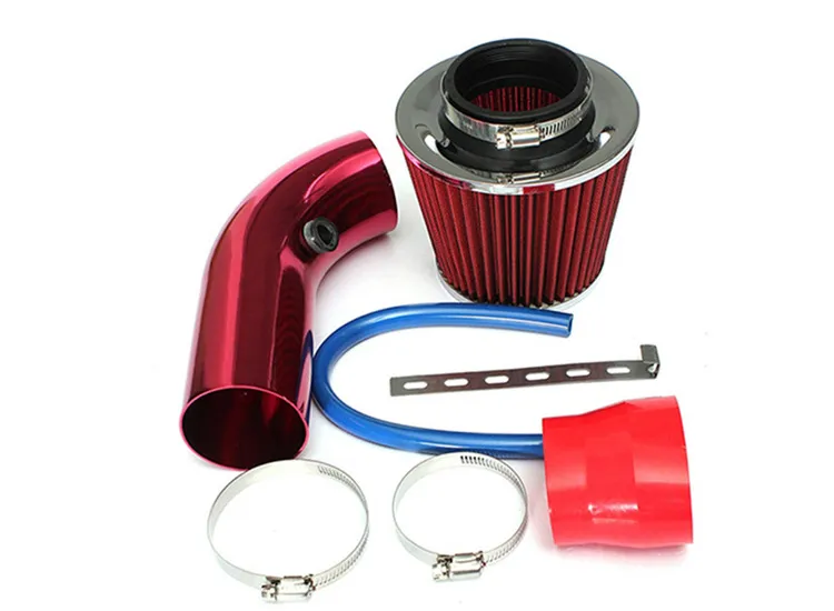 Constructed with a durable aluminum alloy intake pipe and a mushroom head available in carbon fiber pattern, blue, or red, this air filter combines style and functionality. The mushroom head measures 15 cm height, 15 cm bottom diameter, and 11.7 cm top diameter, with a 7.5 cm interface diameter, while the aluminum pipe supports an outer diameter of 7.5 cm with a flexible rubber sleeve (6.3–7.5 cm) for a snug fit.