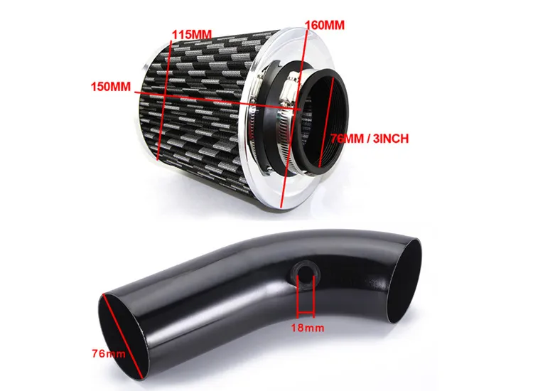 Constructed with a durable aluminum alloy intake pipe and a mushroom head available in carbon fiber pattern, blue, or red, this air filter combines style and functionality. The mushroom head measures 15 cm height, 15 cm bottom diameter, and 11.7 cm top diameter, with a 7.5 cm interface diameter, while the aluminum pipe supports an outer diameter of 7.5 cm with a flexible rubber sleeve (6.3–7.5 cm) for a snug fit.