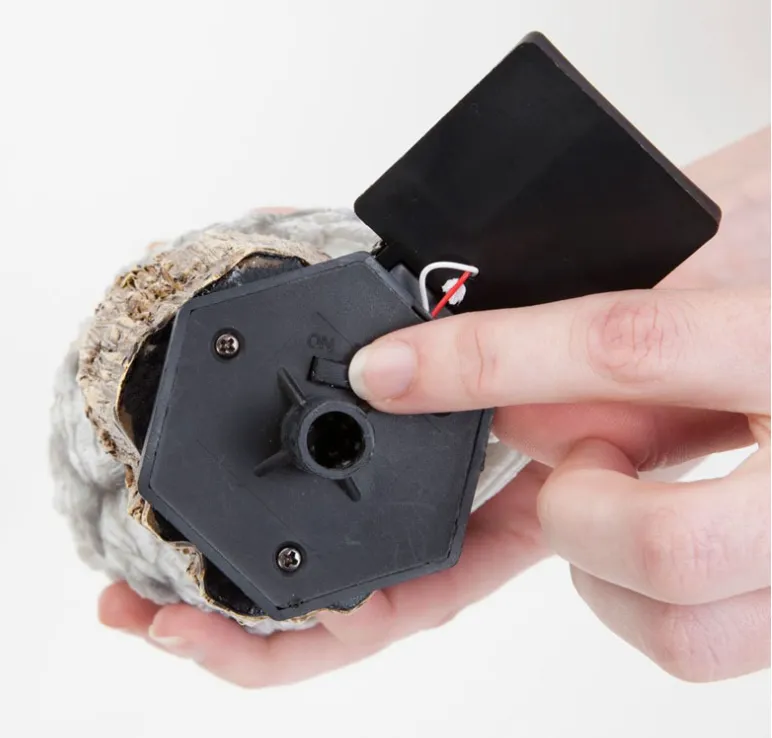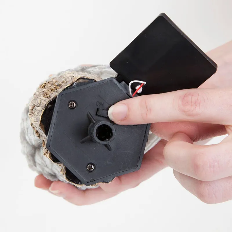the solar panel and stored in the rechargeable battery. When it is dark at night (you can also block the solar panel with your hand, so you