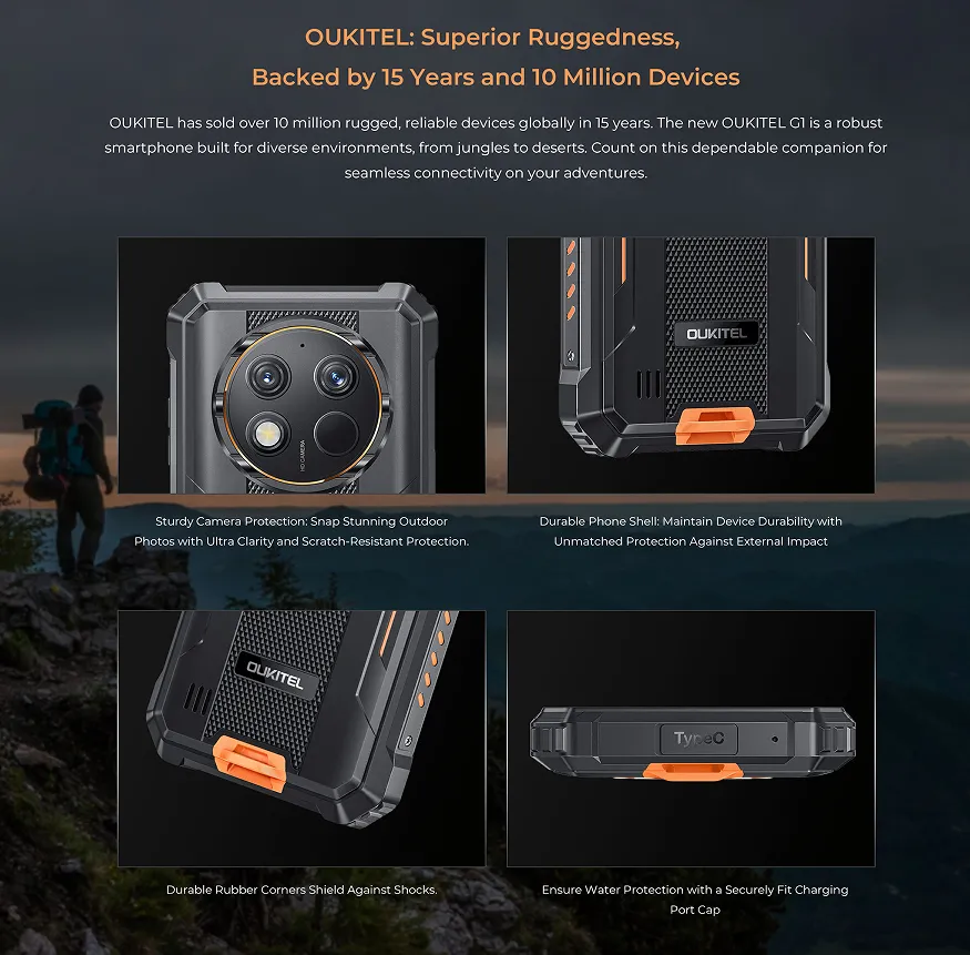Built with a durable plastic shell and available in Gray, Green, and Orange, the Oukitel G1 combines toughness with a bold look. Whether you're on a job site or in the wild, this rugged smartphone offers unbeatable endurance, strong specs, and smart design for everyday use.