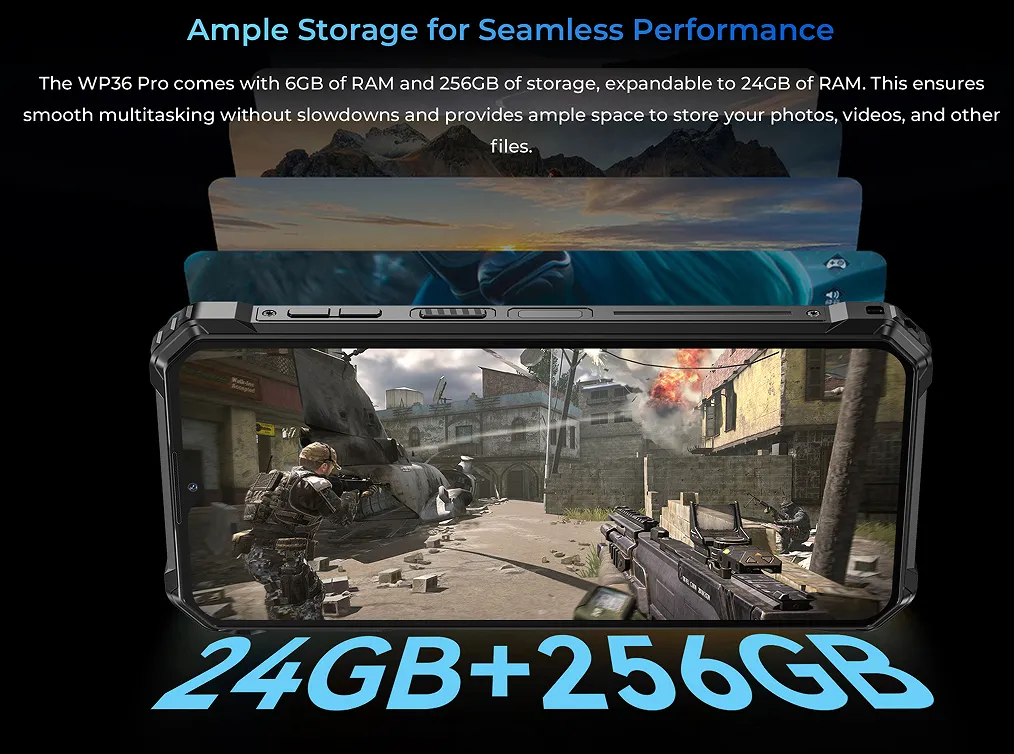 Powered by Android 14 and equipped with a massive 24GB RAM (12GB + 12GB virtual) and 256GB internal storage, the WP36 Pro handles multitasking, gaming, and heavy apps with ease. Its 10600mAh battery ensures days of usage on a single charge—ideal for field use or travel. The device maintains a compact yet tough exterior, made with reinforced plastic housing for durability without excess weight.