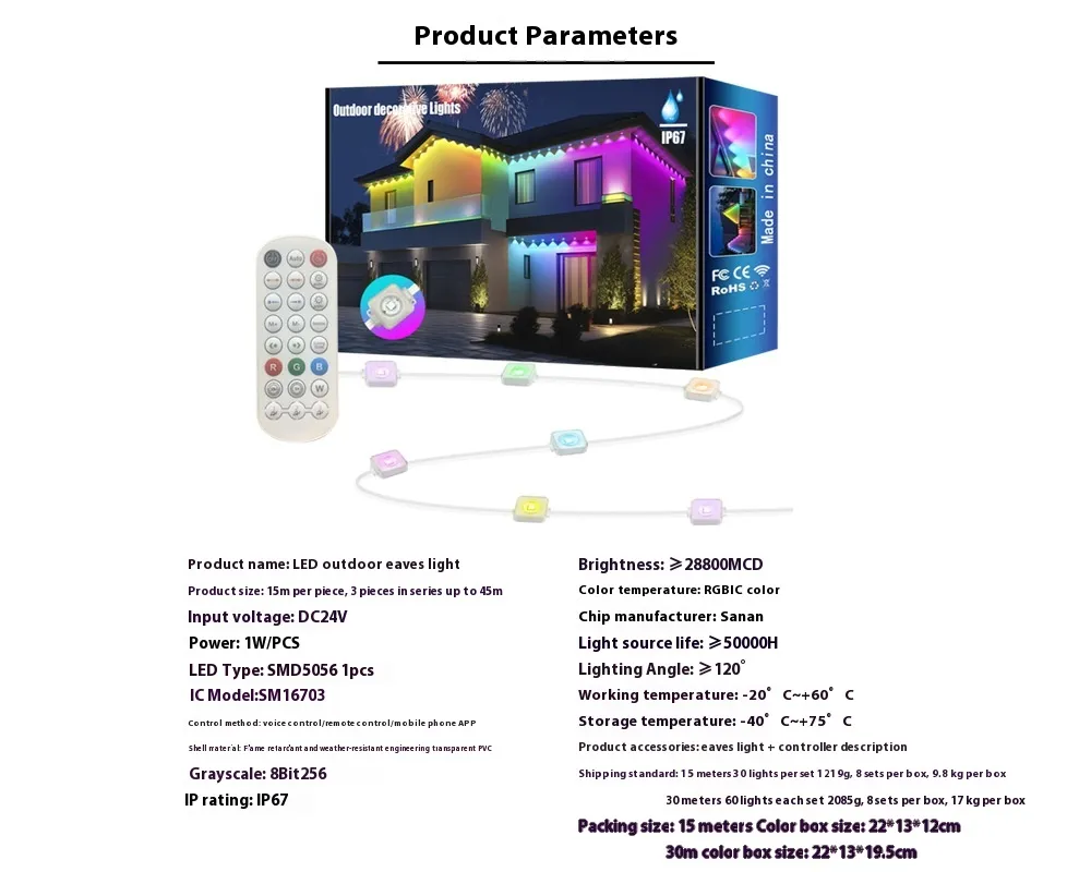 Enhance your outdoor spaces with this versatile Outdoor Eaves Light, designed for color-matched lighting in various scenarios. Ideal for patios, gardens, eaves, or building faΓ§ades, it delivers dynamic illumination that can complement any setting. Its flexible design allows easy installation along rooflines, walls, or outdoor structures to create stunning visual effects.