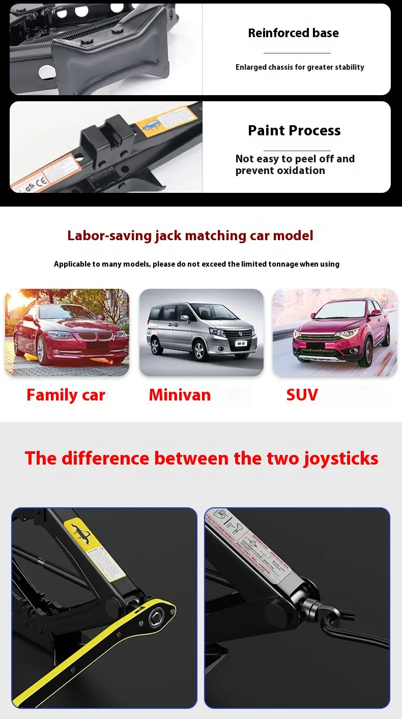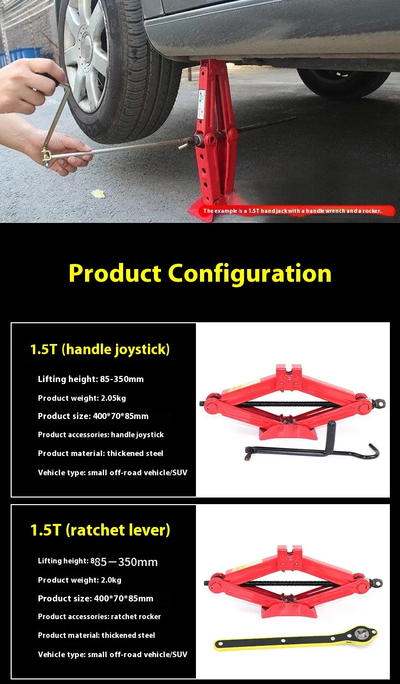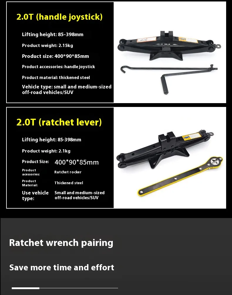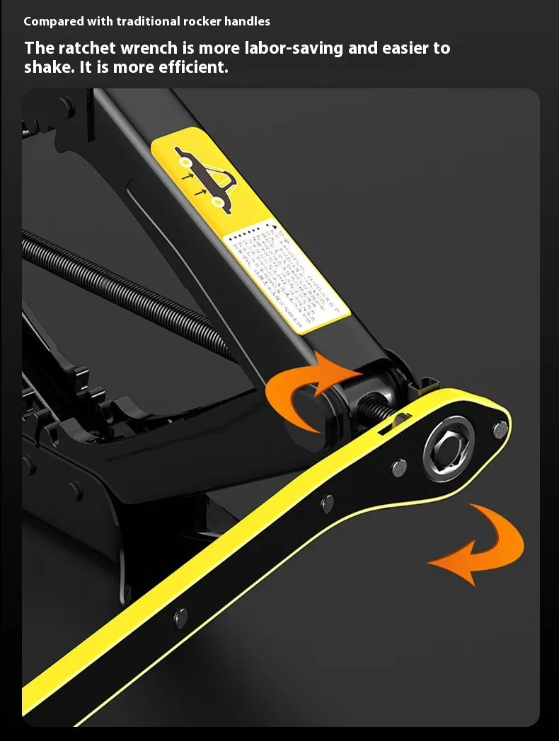 Be prepared for roadside emergencies with this portable 2T ratchet scissor jack. Built from durable steel, it offers reliable strength and stability, making tire changes and car lifting safe and hassle-free. Its labor-saving ratchet design makes operation smoother and easier compared to traditional jacks.