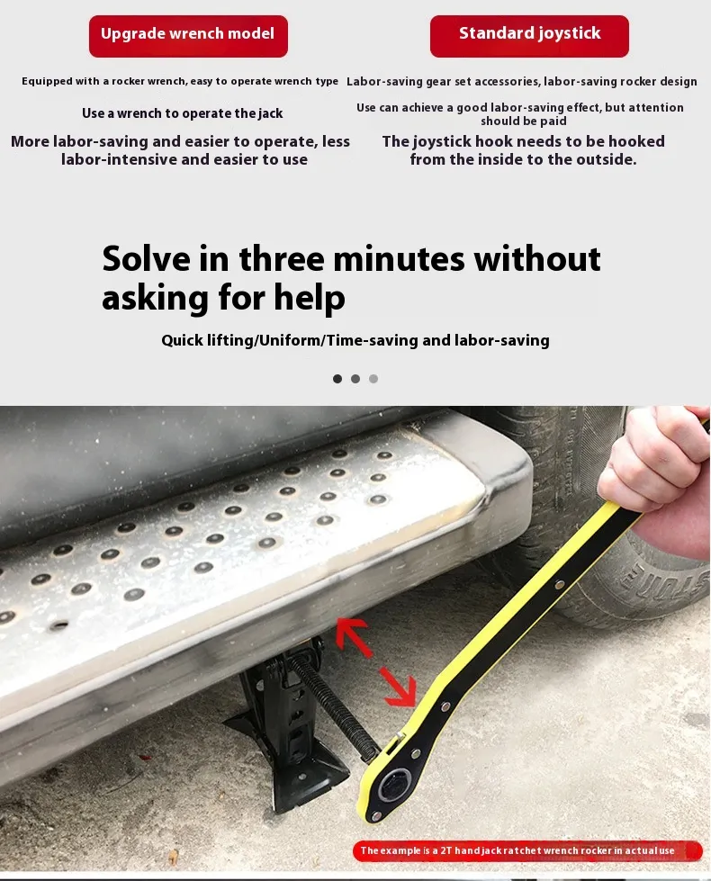 Be prepared for roadside emergencies with this portable 2T ratchet scissor jack. Built from durable steel, it offers reliable strength and stability, making tire changes and car lifting safe and hassle-free. Its labor-saving ratchet design makes operation smoother and easier compared to traditional jacks.