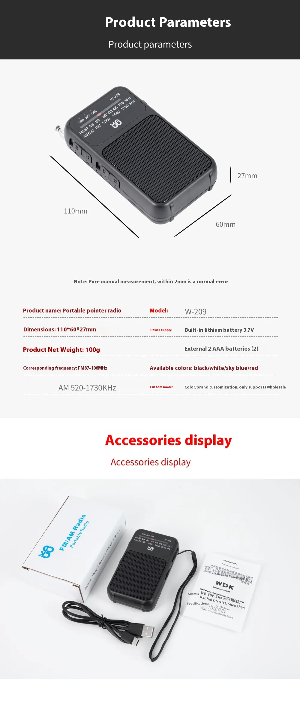 Crafted from durable ABS material and available in multiple colors (black, white, red, sky blue), this pocket-sized radio is stylish, functional, and easy to carry. With a 2W rated power and dimensions of just 110 Γ 60 Γ 27 mm, itβs compact enough to fit in your hand while delivering clear mono sound.
