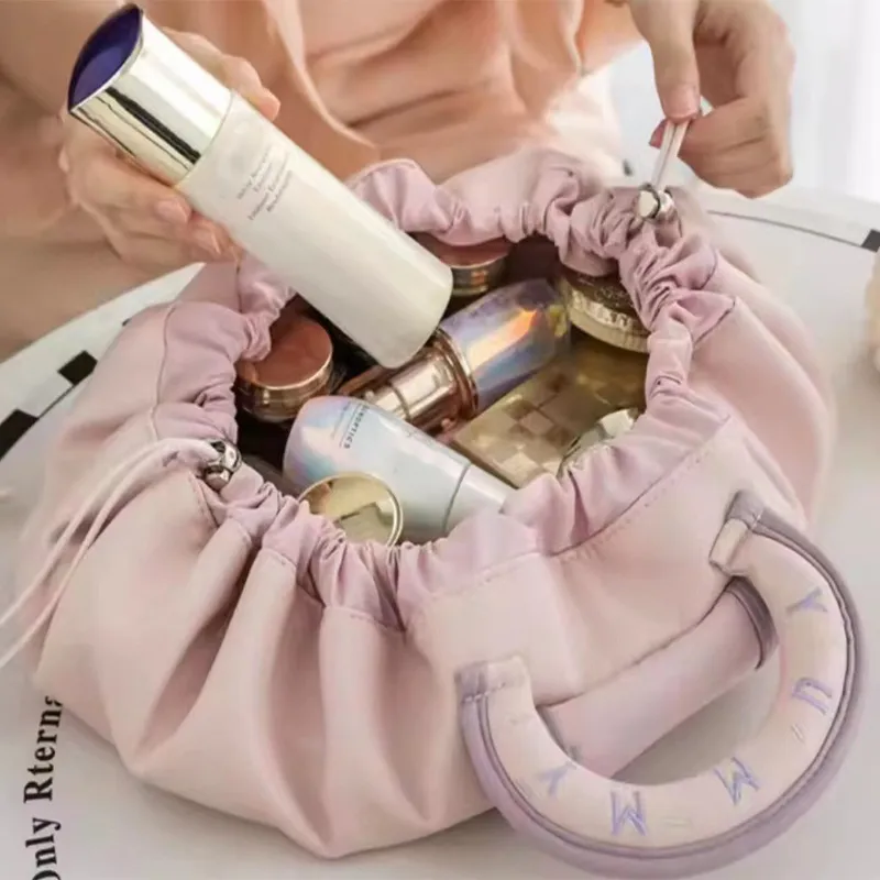 Portable Drawstring Cosmetic Bag – Large Capacity Waterproof PU Makeup Handbag with Handle for Travel & Storage