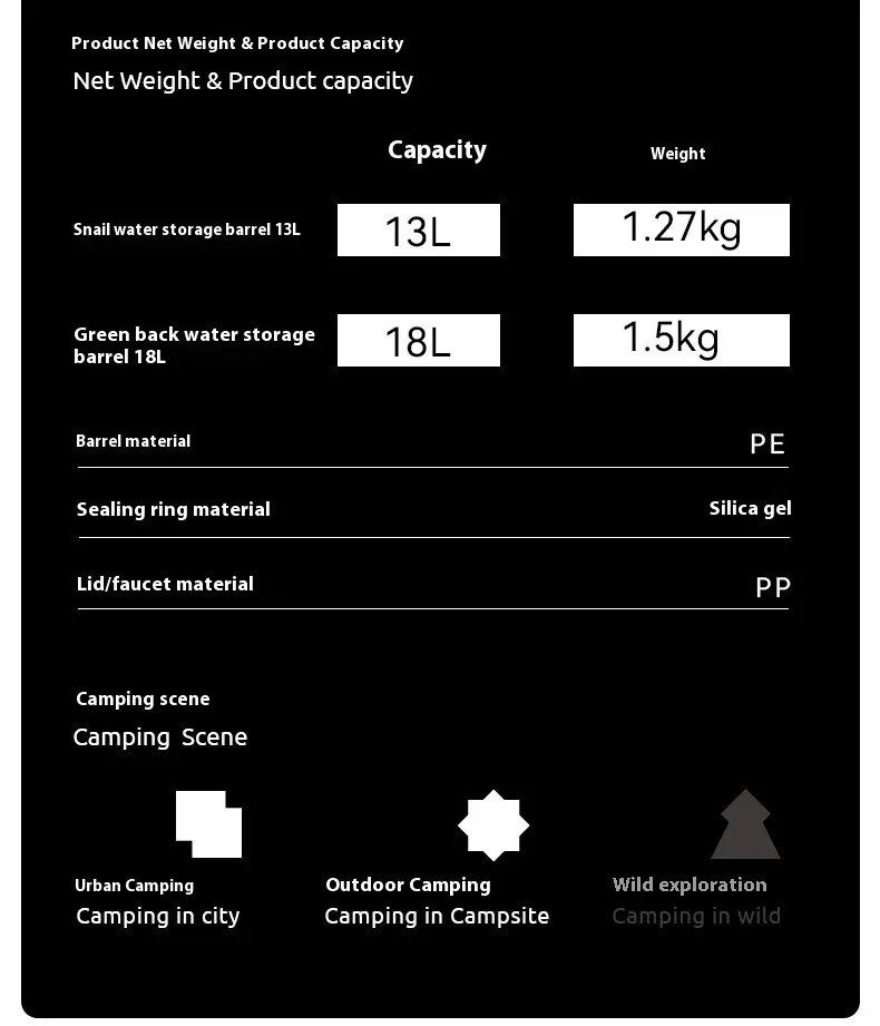 Available in two convenient sizes β 13L (snail design) and 18L (green back design) β this tank allows you to store and dispense clean water efficiently, whether youβre on a campsite, road trip, or during household water shortages. The ergonomic handle ensures easy transport, and the compact structure makes it ideal for fitting into vehicles, storage units, or kitchen spaces.