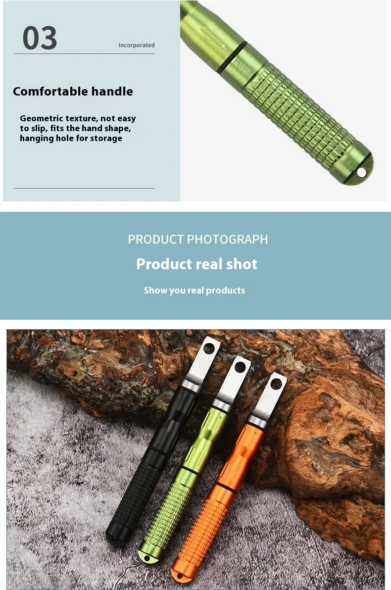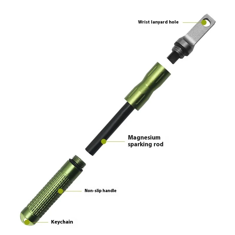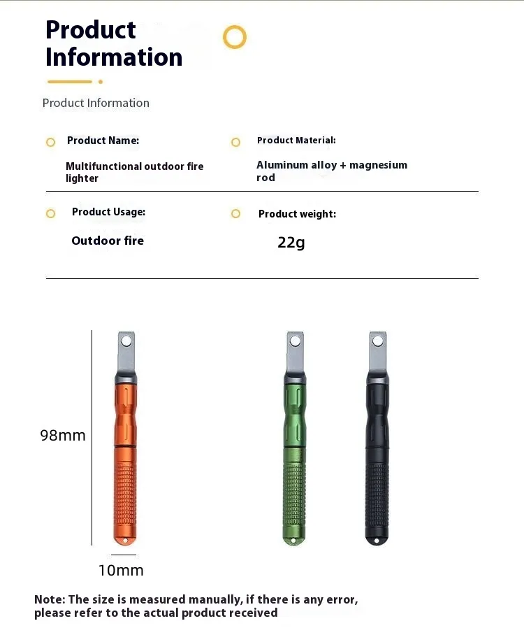 Crafted from durable aluminum alloy with a magnesium bar, this lightweight fire starter (22g) is highly portable and easy to carry. Measuring 10 Γ 10 Γ 98mm, it fits conveniently in a pocket, backpack, or survival kit, making it perfect for outdoor adventures.