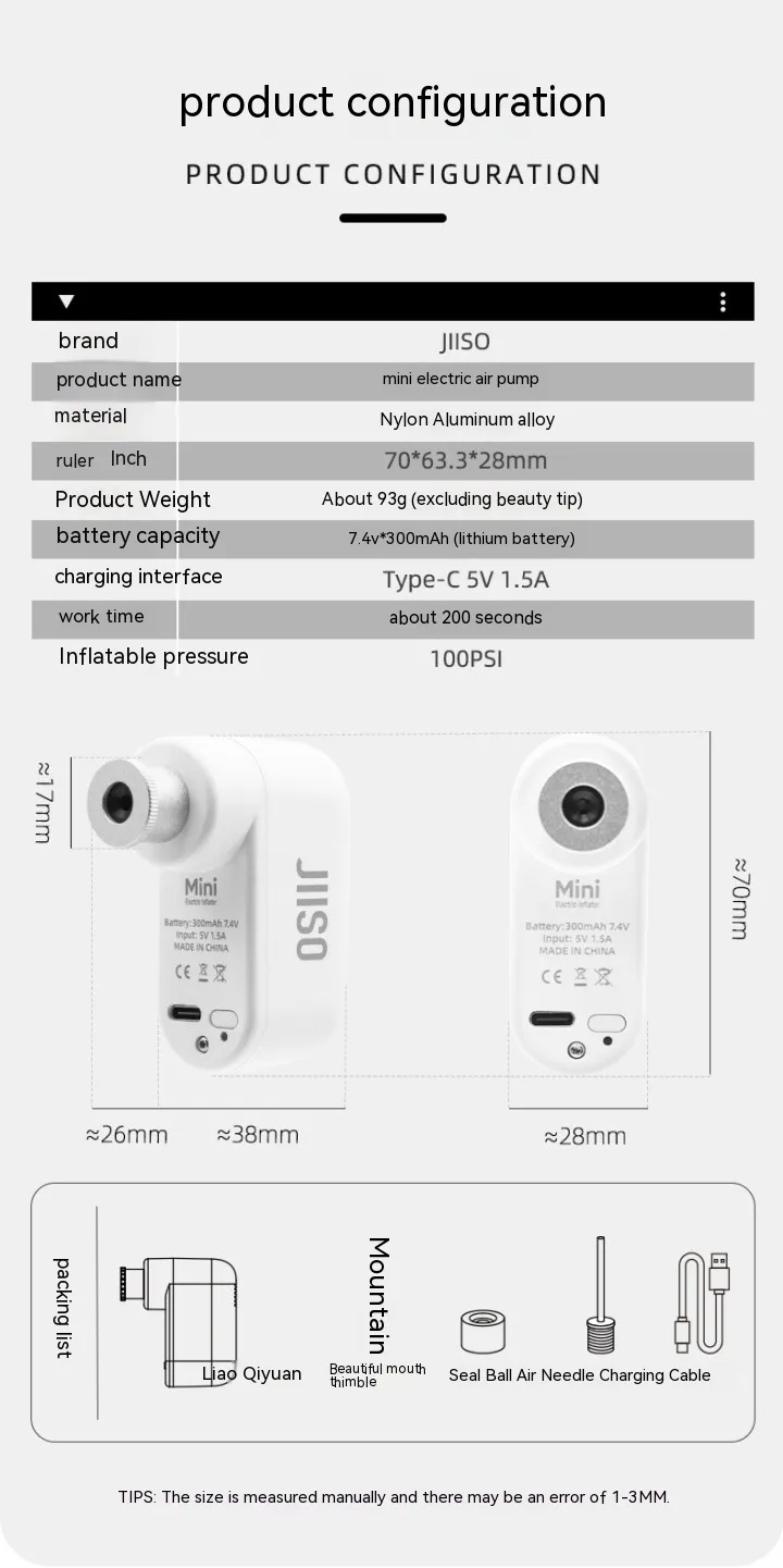 The pump weighs only 93g and measures just 70 × 63.3 × 28mm, making it extremely portable. The package includes an air pump, Meizui top needle, sealing accessories, ball-type air needle, and a charging cable, giving you everything you need for reliable inflation on the go.