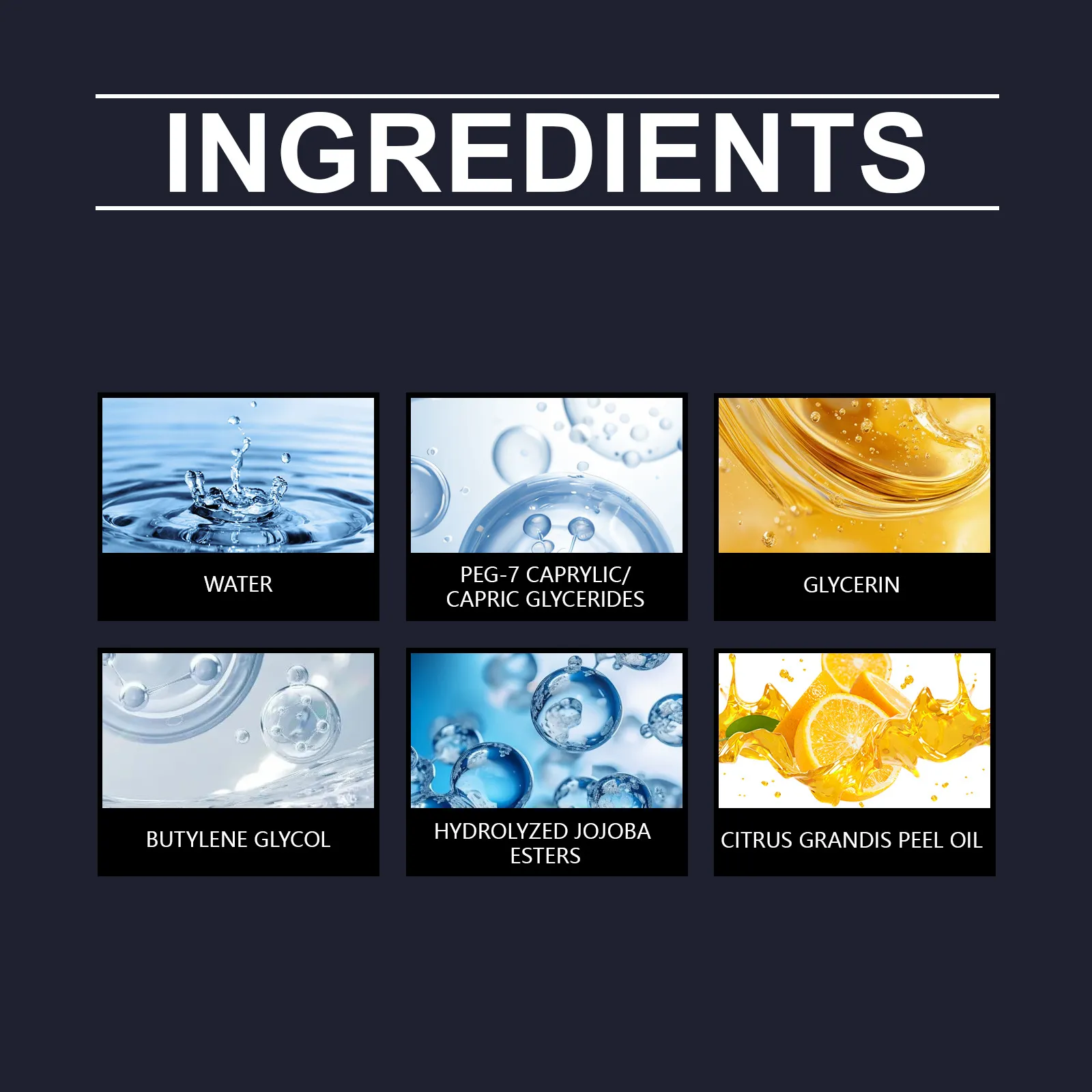 Ingredients :Water, PEG-7 Octanoic Acidcapric Acid Glycerides, Glycerol, Butanediol, Hydrolyzed Jojoba Esters, Citrus Peel Oil