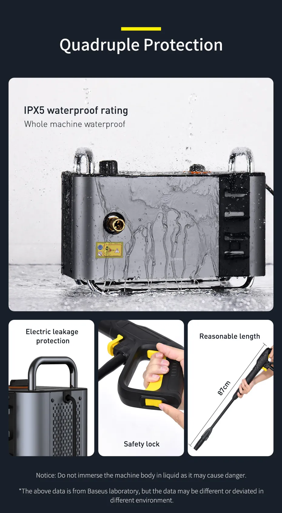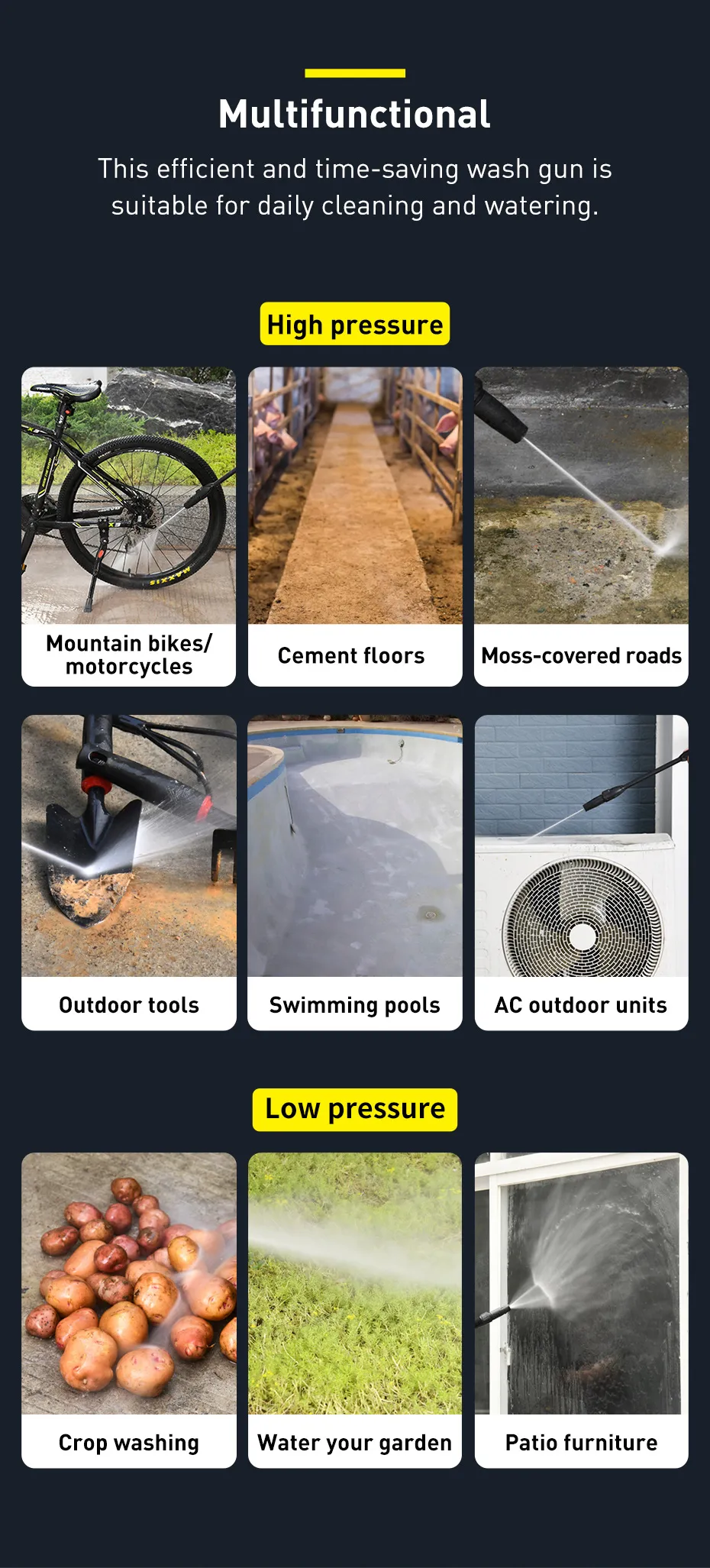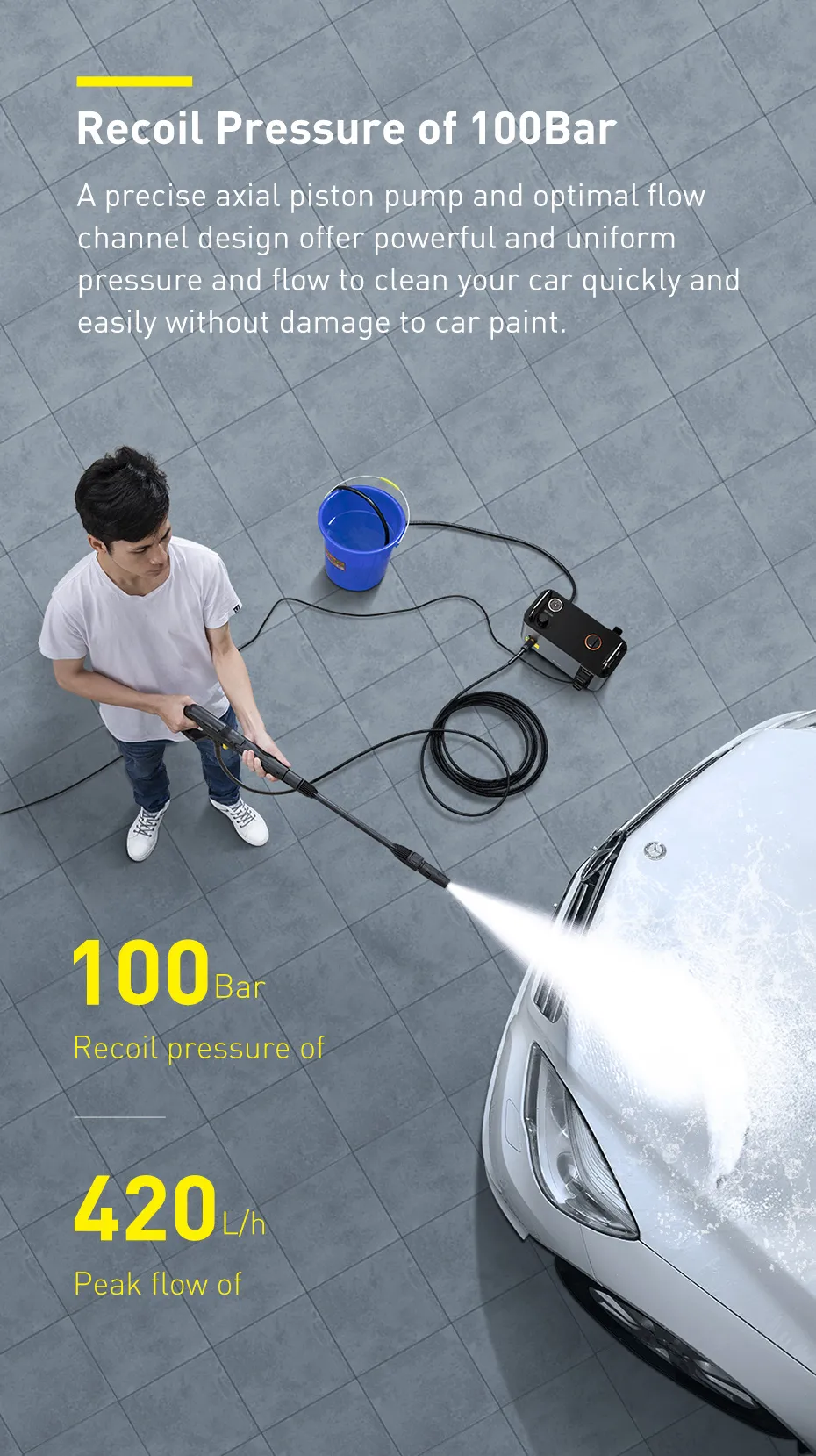The washer offers a rated flow of 5L/min and a maximum flow of 420L/h, making it water-efficient while providing strong cleaning force. Its 10m outlet pipe allows extended reach for washing cars, patios, driveways, and more. Accessories include a high-pressure gun, universal connectors, self-suction adapter, and water inlet pipes for quick setup.