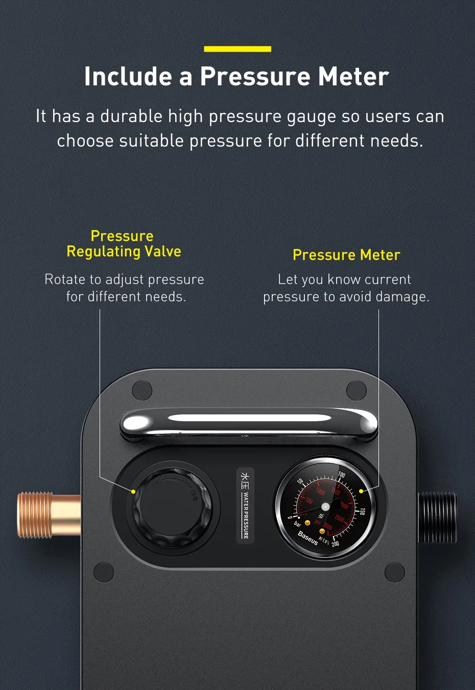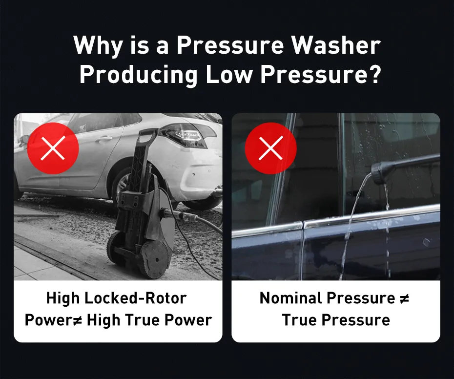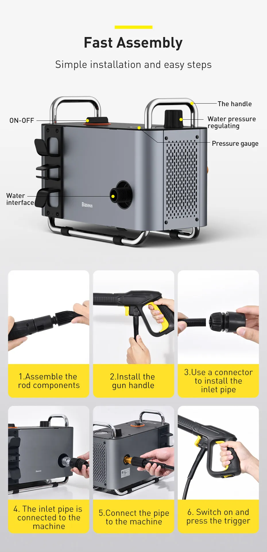The washer offers a rated flow of 5L/min and a maximum flow of 420L/h, making it water-efficient while providing strong cleaning force. Its 10m outlet pipe allows extended reach for washing cars, patios, driveways, and more. Accessories include a high-pressure gun, universal connectors, self-suction adapter, and water inlet pipes for quick setup.