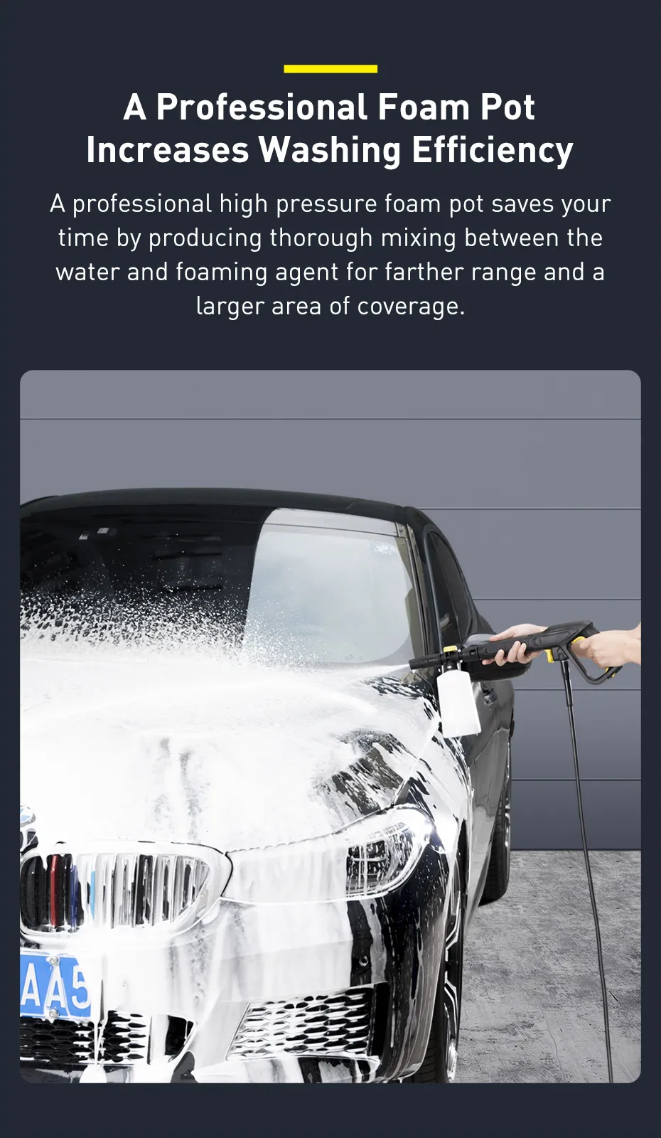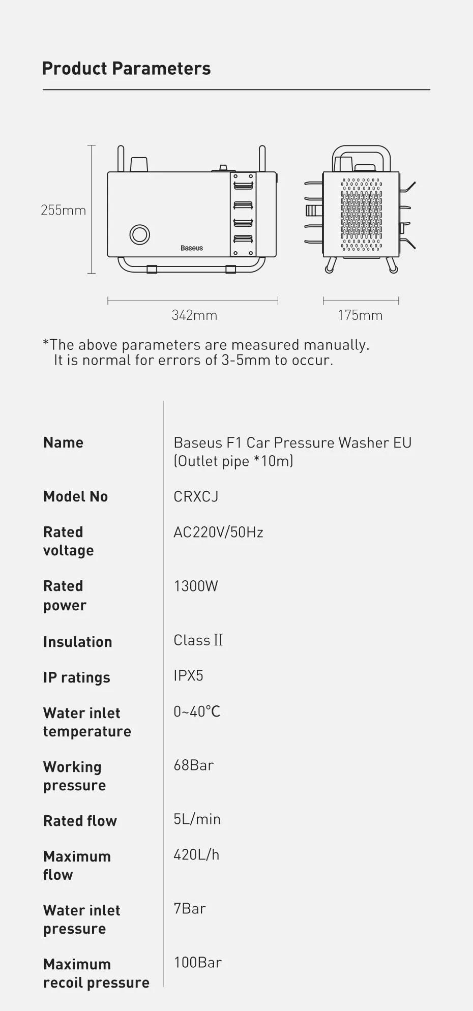 This professional 1300W car jet washer provides powerful and efficient cleaning for vehicles, outdoor surfaces, and equipment. Built with Class II insulation and IPX5 water resistance, it delivers safe, long-lasting performance. With a maximum recoil pressure of 100bar and working pressure of 68bar, it ensures a thorough clean without damaging surfaces.