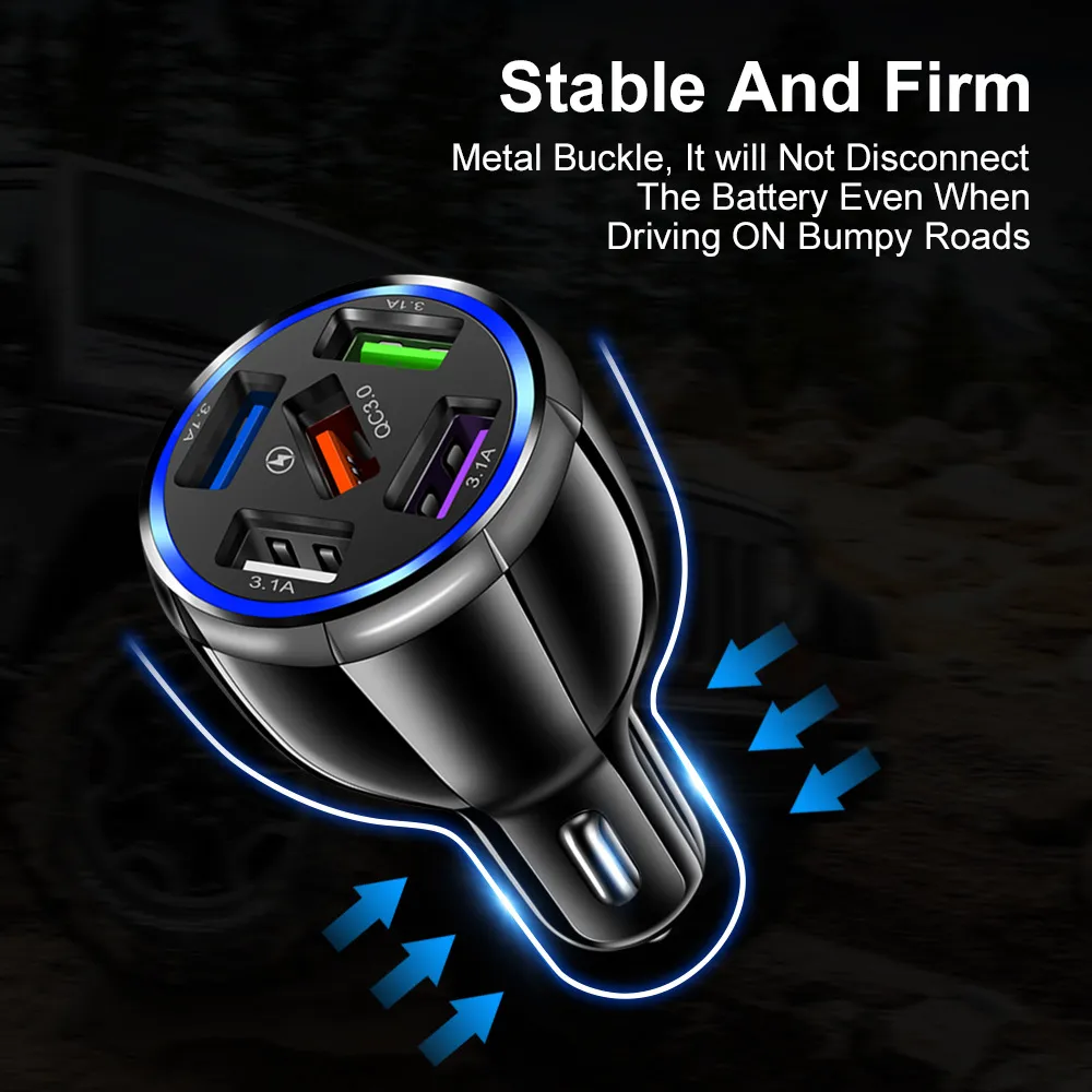 Charge all your devices on the go with the QC30 Car Mobile Phone Charger with 5 USB Ports, designed to power up smartphones, tablets, and other gadgets simultaneously. Its multiple USB outputs allow efficient charging for up to five devices, perfect for family trips or busy commutes.