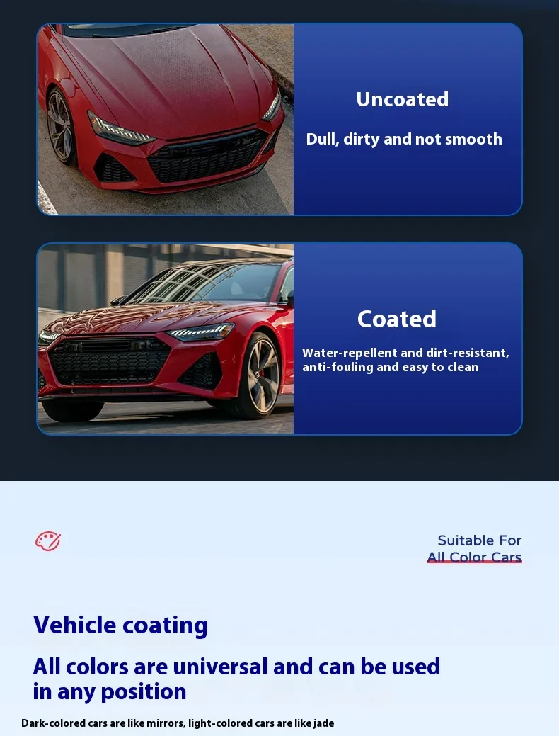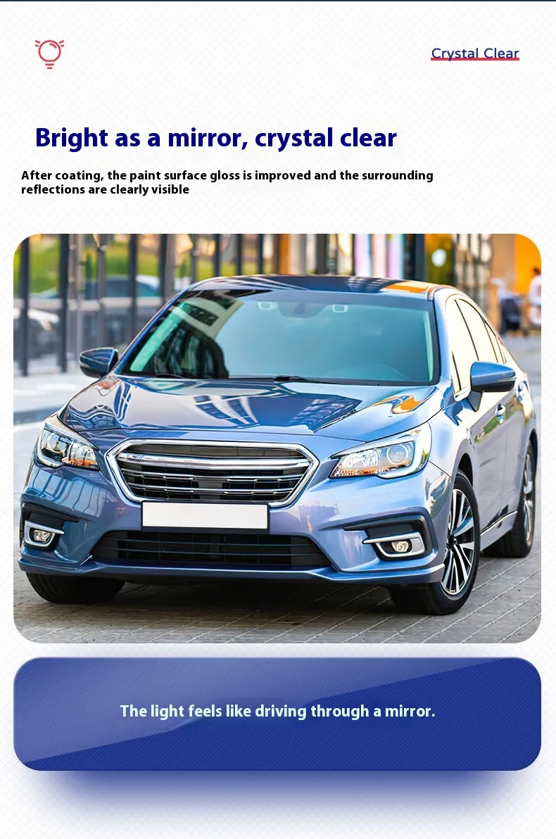 Give your car’s paint a mirror-like finish with our Quick-Acting Automotive Coating Agent, formulated with advanced nanometer crystal technology. This liquid coating enhances gloss, restores color depth, and forms a protective layer that shields against dirt, water spots, and UV damage. The quick-dry formula makes application effortless, giving your vehicle an instant, professional-grade shine.