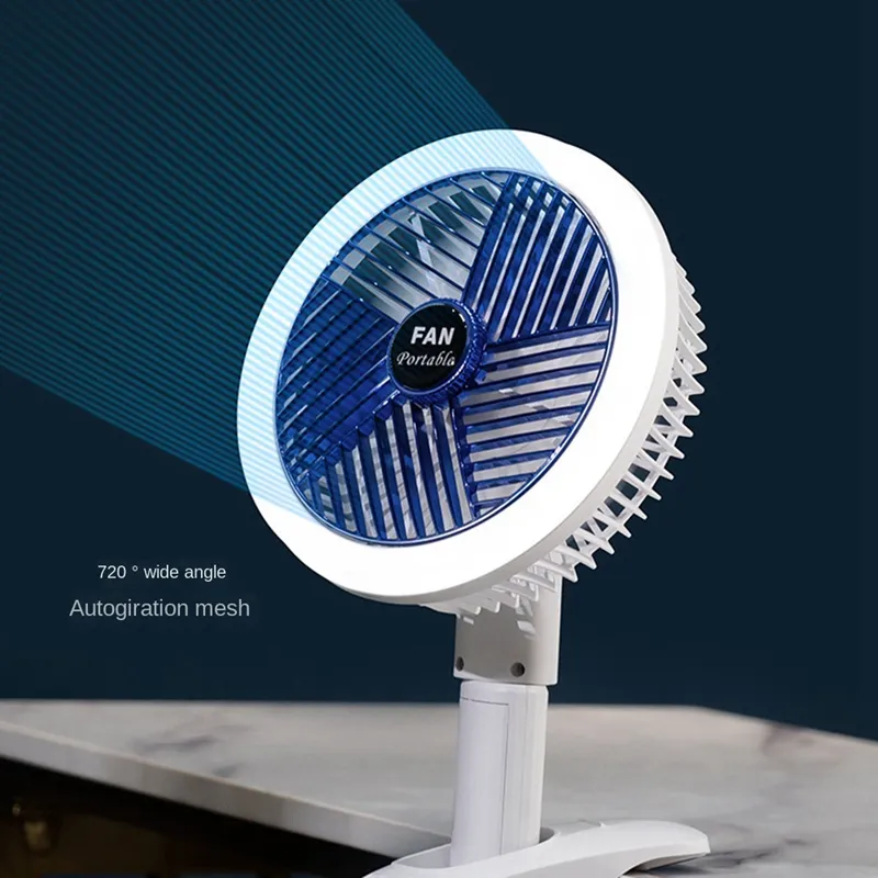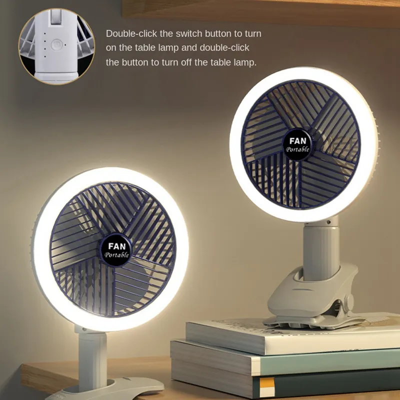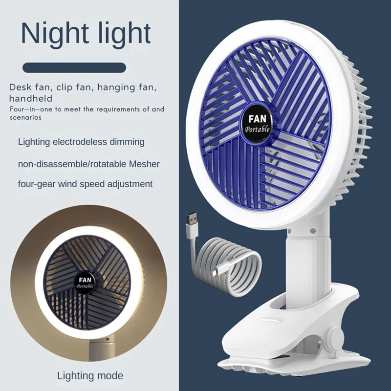 Rechargeable Clip-On Desk Fan with LED Light – 4-Speed USB Portable Fan for Home, Office & Dormitory