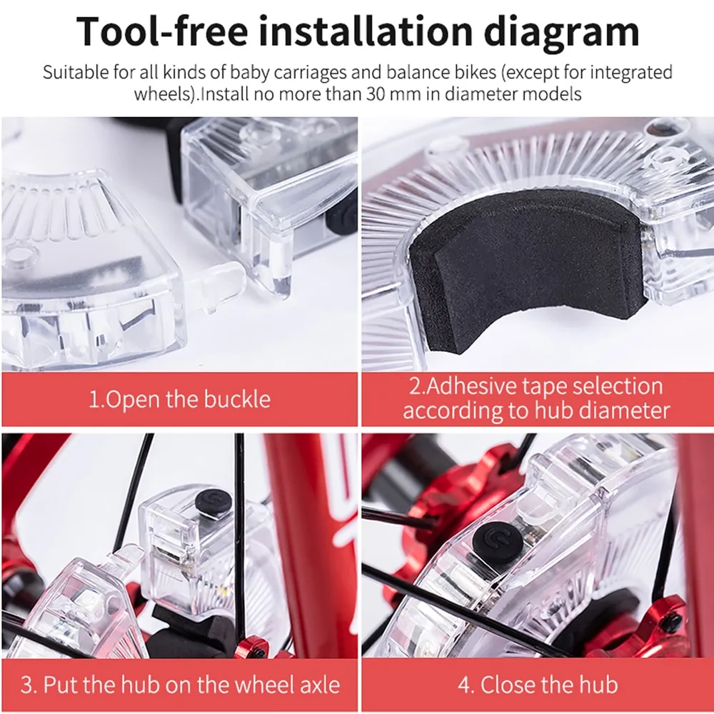 With a simple installation process that fits hub diameters up to 3 cm, this accessory is easy to mount and stays firmly in place during riding. Whether used for safety, decoration, or both, it brings vibrant illumination and rechargeable convenience to young riders’ wheels, helping them stay visible and stylish at night.