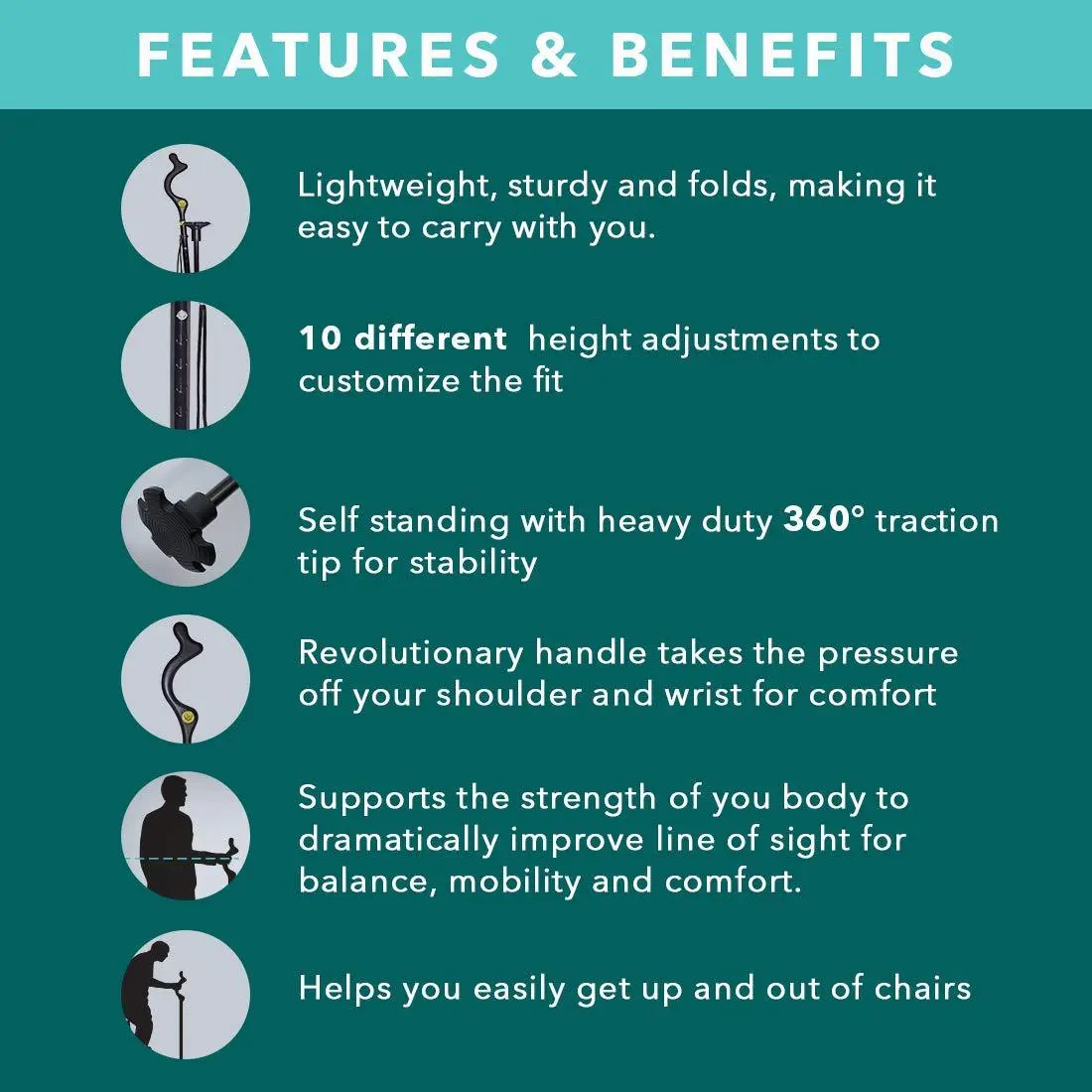 Built for adaptability, this posture cane features 10 adjustable height settings, making it suitable for users of different heights and needs. The sturdy, anti-slip base with a 360° traction ring ensures superior ground grip across multiple surfaces, reducing the risk of slips and improving stability. It’s also designed to stand on its own, keeping the cane within easy reach at all times—no more bending or struggling to pick it up.