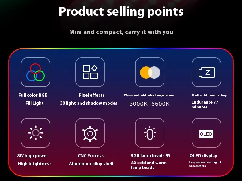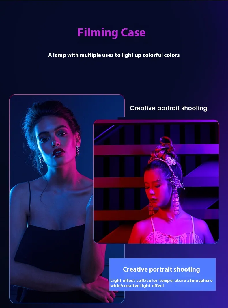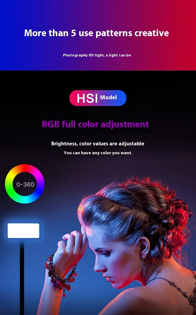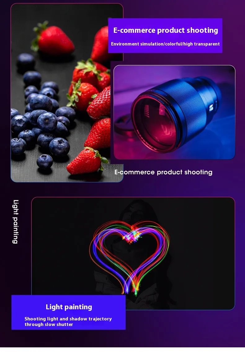 This RGB full color pocket LED photography light is designed to enhance visual creativity for photography, videography, and light painting. With a wide adjustable color temperature range from 3000K to 6500K, it allows users to create warm, neutral, or cool lighting effects to match different shooting environments and artistic styles.