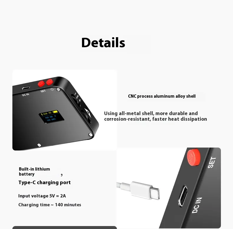 Packing List: fill light, cloth bag, charging cable, instruction