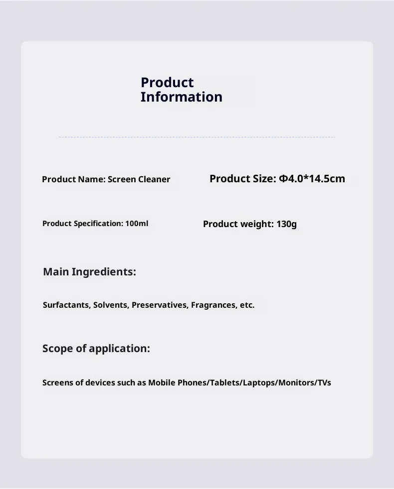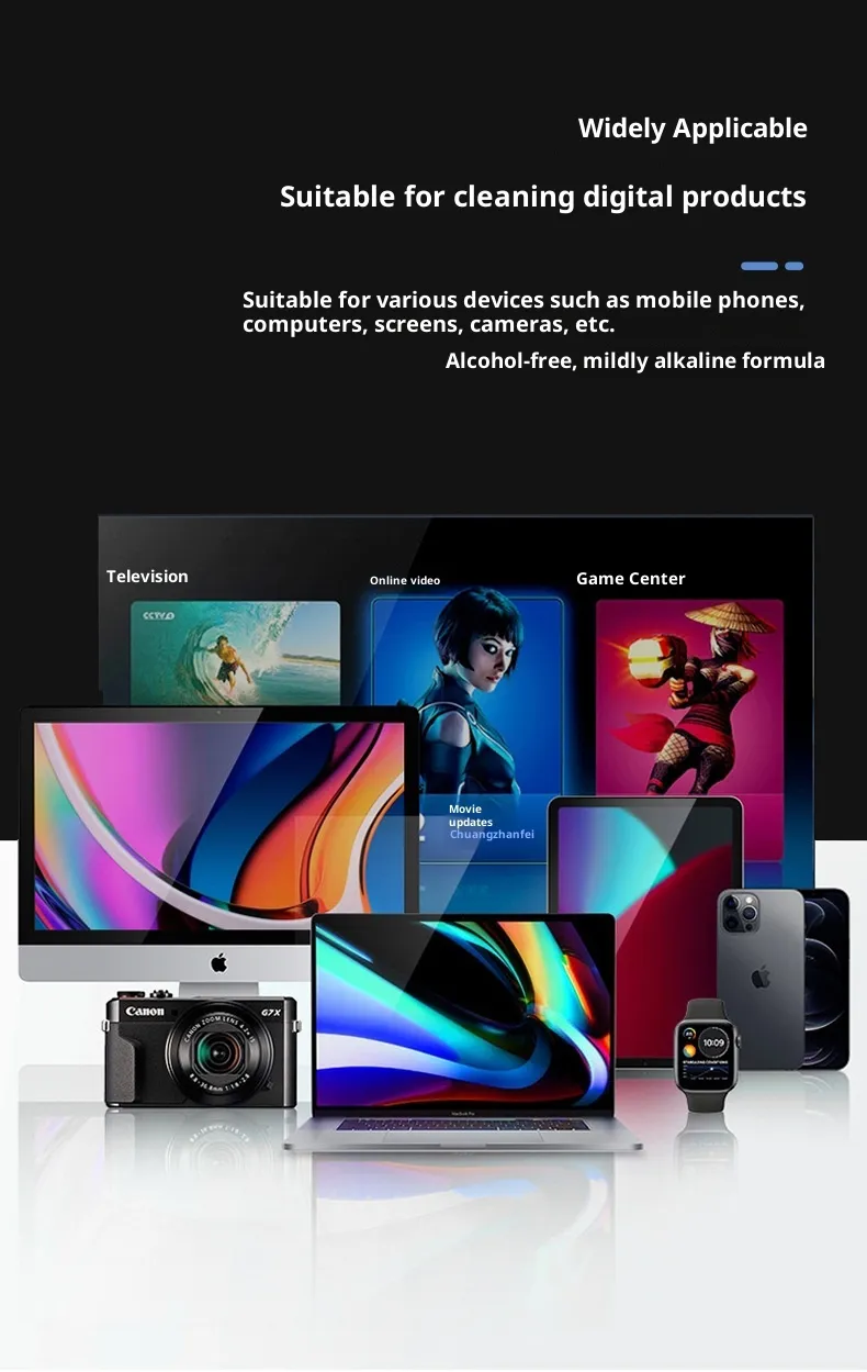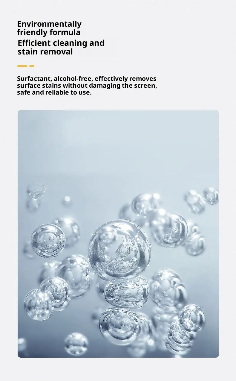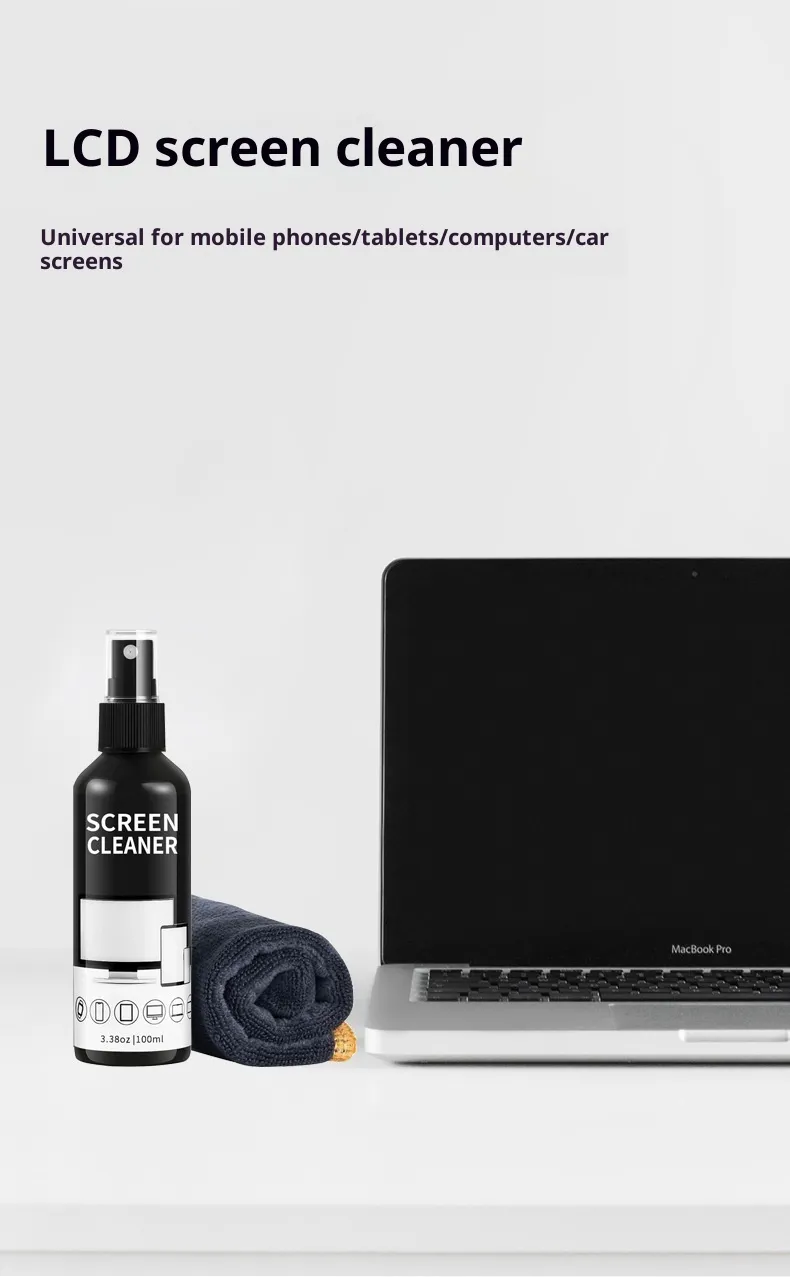This screen cleaning kit is designed to safely and effectively remove dirt, fingerprints, and smudges from electronic displays. It is suitable for mobile phones, tablets, laptops, monitors, televisions, and car central control screens. The kit combines a 100ml cleaning solution with a soft wiping cloth to provide streak-free results and maintain screen clarity.