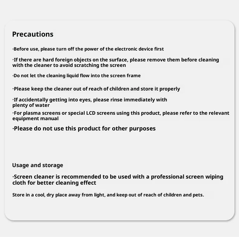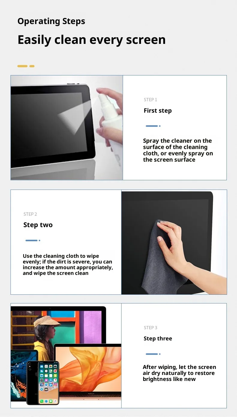 Compact and easy to use, this cleaning set is perfect for home, office, or vehicle use. Simply spray the solution onto the cloth and wipe the screen for a clear, streak-free finish. Ideal for daily maintenance, it ensures that all your electronic screens remain hygienic and visually sharp.