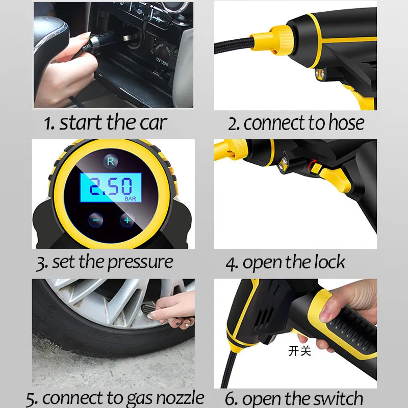 Powered by a 120W motor and operating via a DC 12V car socket, this mini air pump delivers fast and efficient inflation. Its powerful airflow and multi-use connectors make it suitable for a wide range of applications, from vehicle tires and air mattresses to basketballs and pool floats. The device’s user-friendly interface and clear LED display provide accurate pressure readings at a glance—even at night.