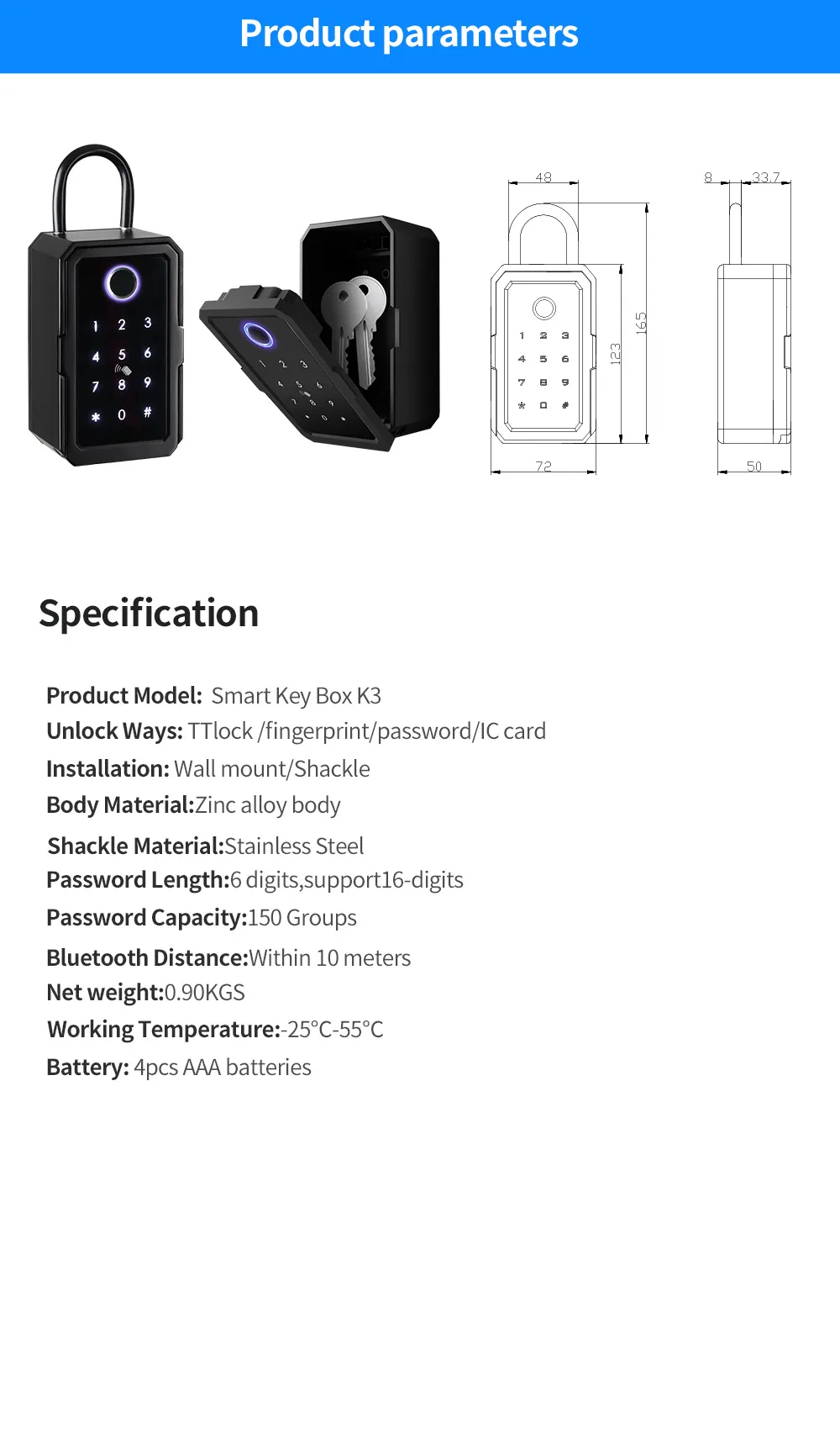 Ideal for home, office, Airbnb, or outdoor use, this lock box is built to withstand tough conditions, operating in temperatures from -25°C to 55°C. With graffiti-style input for added privacy and security, plus fingerprint and sensor card functionality, it redefines access convenience. Backed by battery power (4 AAA batteries required), the Smart Fingerprint & Password Storage Lock Box – TTLock App, Bluetooth, Graffiti Unlock with Keyless Access is your all-in-one smart locking solution.