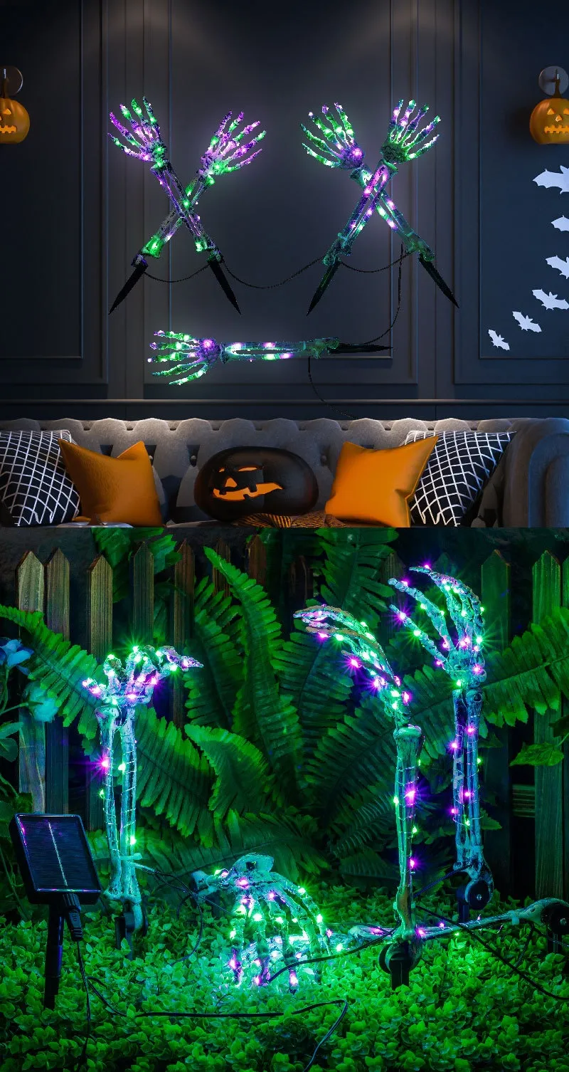 Create a spooky and festive atmosphere this Halloween with this solar-powered ground lamp. Designed with hand bone shapes, it adds a unique decorative touch to courtyards, gardens, pathways, or yards. With five customizable shapes and colorful LED lights, this lamp provides eye-catching illumination for your Halloween parties or seasonal décor.