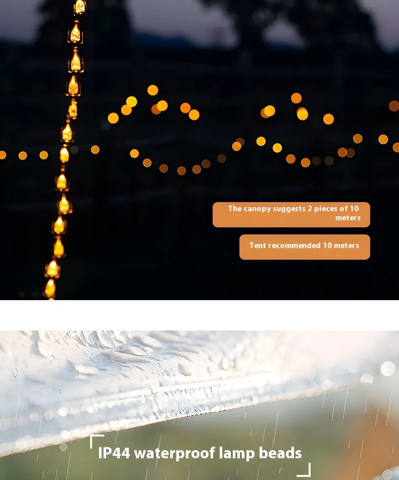 Available in multiple lengthsβ5 meters with 20 lights, 6.5 meters with 30 lights, and 7 meters with 50 lightsβthese lights are powered by solar energy and operate at 220V input voltage. With an IP65 waterproof rating, they withstand rain and outdoor conditions, making them perfect for camping, garden parties, or festive occasions.