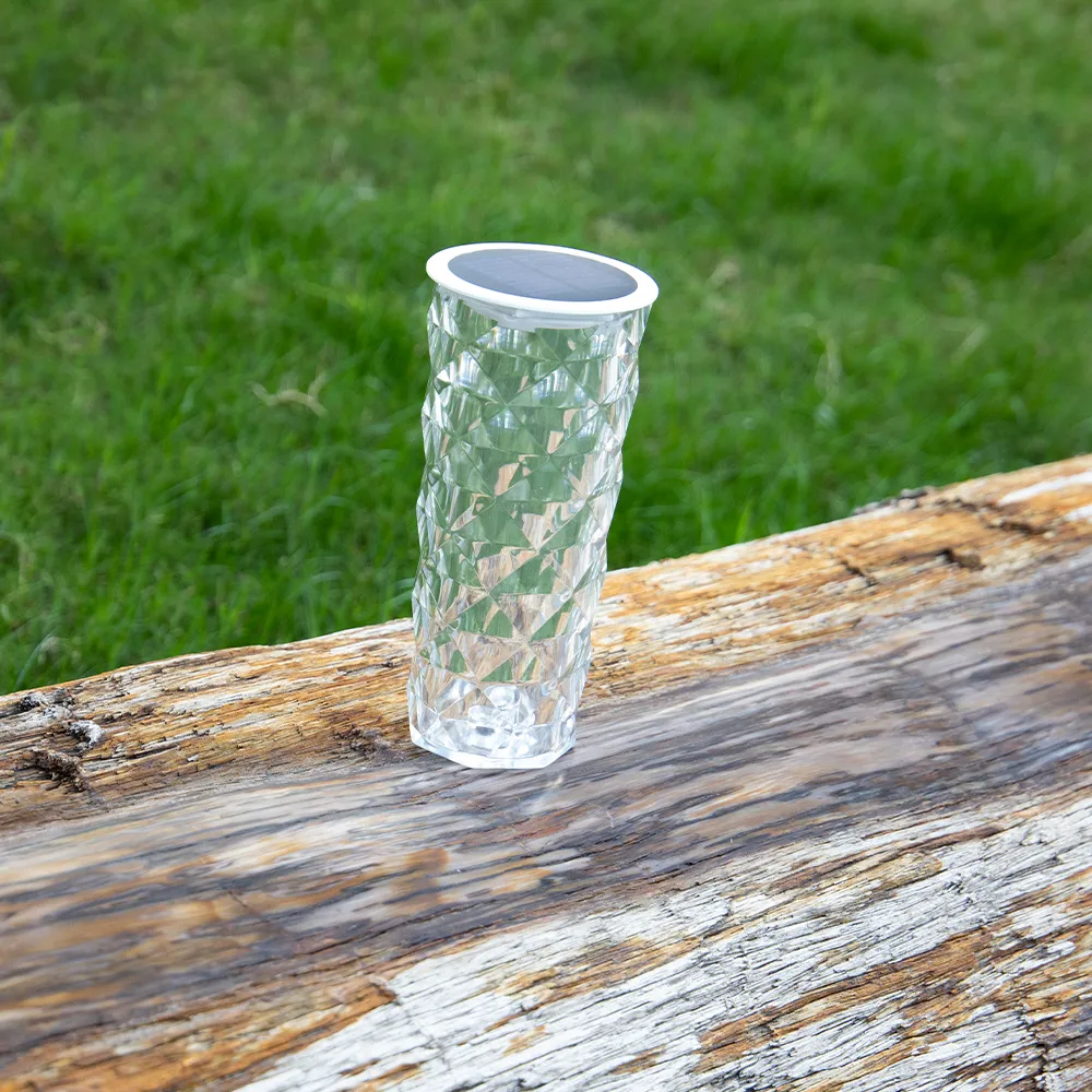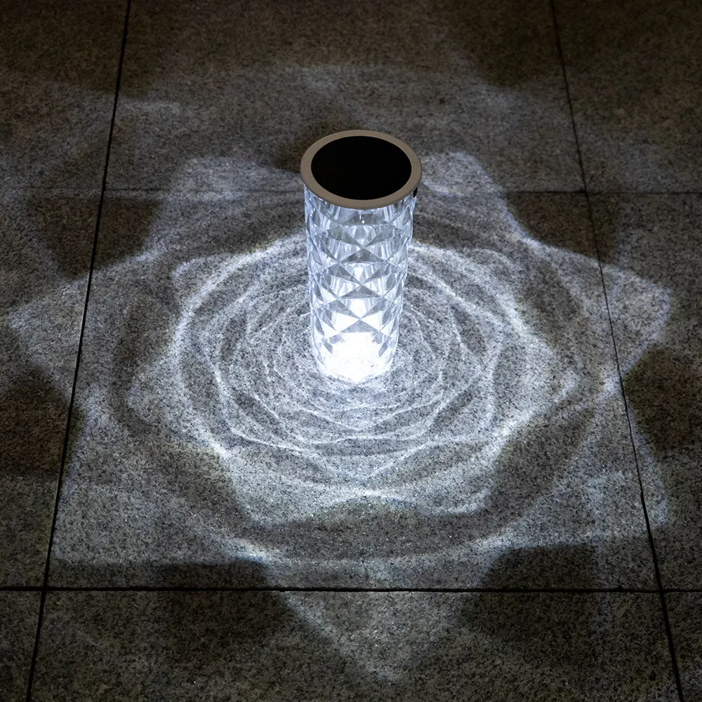 This solar garden lamp brings a touch of romance and elegance to any outdoor space. Designed in a crystal rose shape, it creates a stunning diamond-like illumination that enhances the atmosphere of courtyards, gardens, and patios. The RGBW LED system allows 10 vibrant color options along with white light, producing a mesmerizing display for decorative or ambient lighting.