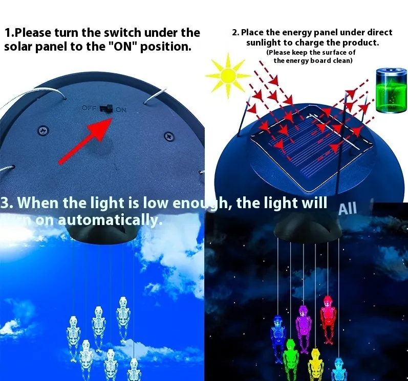 Bring personality and charm to your outdoor spaces with this solar-powered skeleton wind chime light. Designed with a creative humanoid bone shape, it adds a playful yet eye-catching accent to gardens, patios, balconies, and walkways. During the day, it serves as a decorative hanging piece, and at night it transforms into a glowing outdoor ornament.