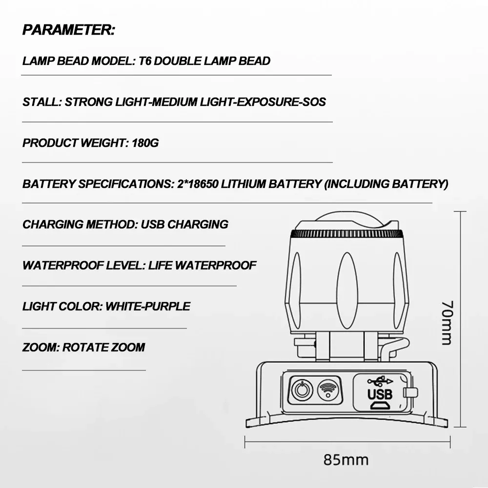 Powered by 2 Γ 18650 lithium batteries (USB rechargeable), this headlamp is lightweight at 180g and easy to carry. Durable and reliable, it delivers consistent lighting performance while adding a modern, tactical look for outdoor enthusiasts and professionals alike.