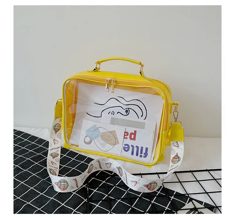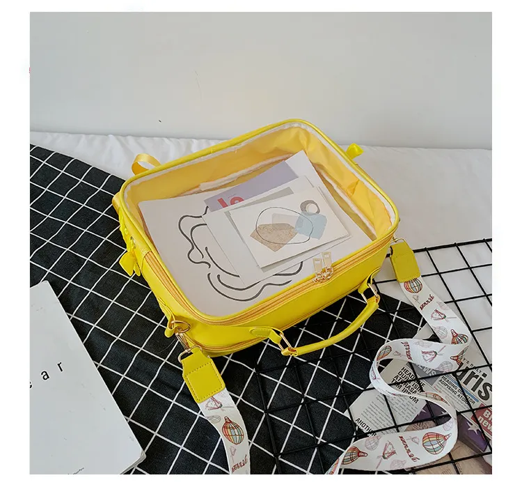 Available in seven vibrant colors — Yellow, Purple, Green, Blue, Black, Pink, and Off-white — this jelly-style transparent bag is lightweight, soft-surfaced, and easy to carry with its comfortable soft handle. Its cheerful design and see-through style make it the perfect choice for young students or anyone who loves standout accessories.