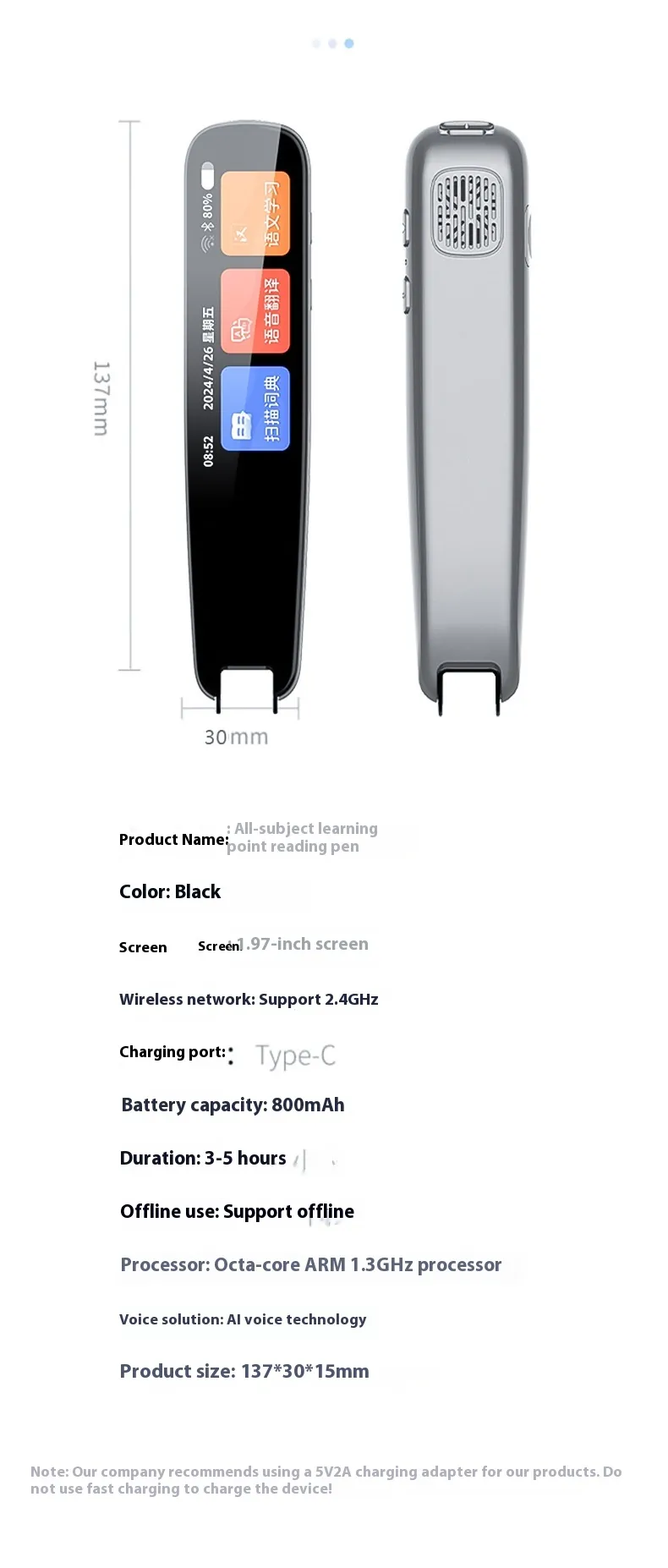 Crafted from durable ABS material, the talking pen is compact and portable, measuring 138 × 30 × 112 mm. It operates at a low voltage of 5V, ensuring safety and energy efficiency. Designed to assist with reading comprehension and pronunciation, it reads aloud scanned content—perfect for improving vocabulary, accent, and fluency.