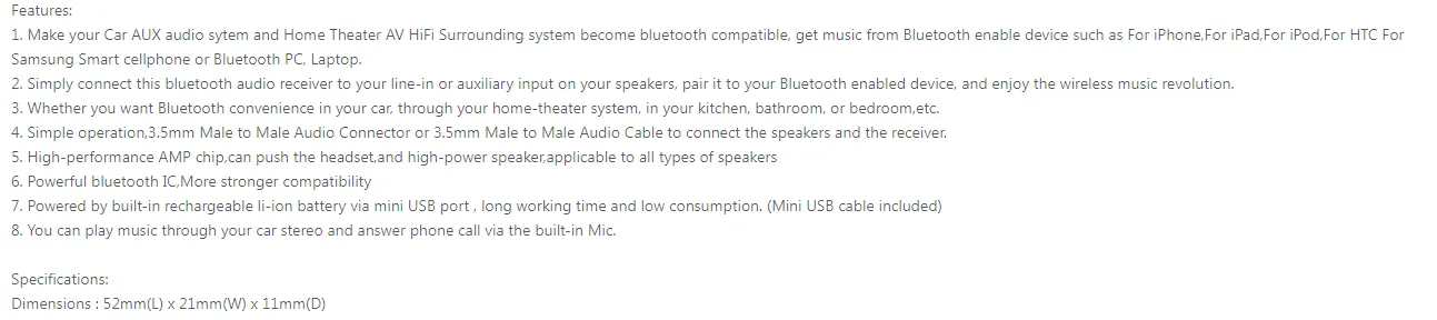 Crafted with durable materials and a portable design, the TuneMate is universal and easy to use. Compatible with smartphones, tablets, and MP3 players, it’s a must-have accessory for anyone who wants wireless freedom on the go. Small in size but big in performance, this Bluetooth AUX dongle keeps you connected anytime, anywhere.