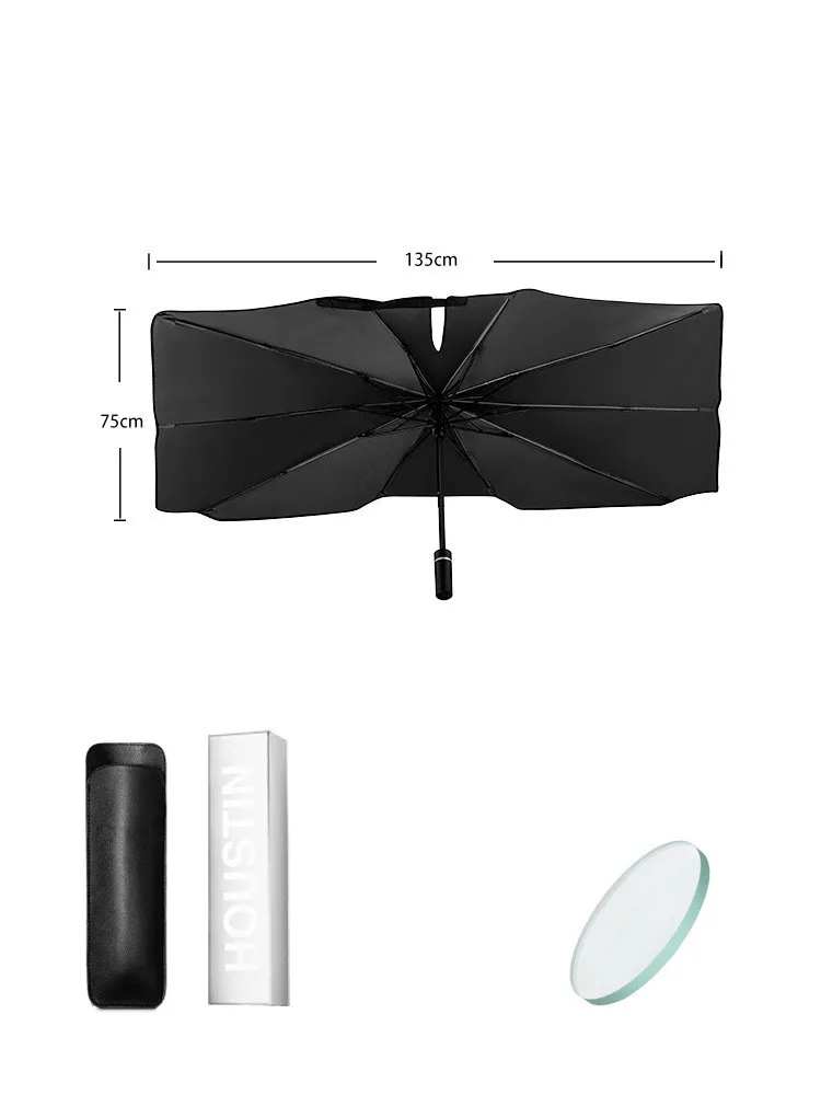 The foldable telescopic design allows for quick setup and easy storage — simply unfold it when you park and collapse it in seconds into the included leather storage bag. Its reinforced stainless-steel frame and frosted handle ensure stability and durability, while the wrapped umbrella beads prevent scratches on your windshield or dashboard. Ideal for daily use, this sun umbrella fits most cars, SUVs, vans, and trucks.