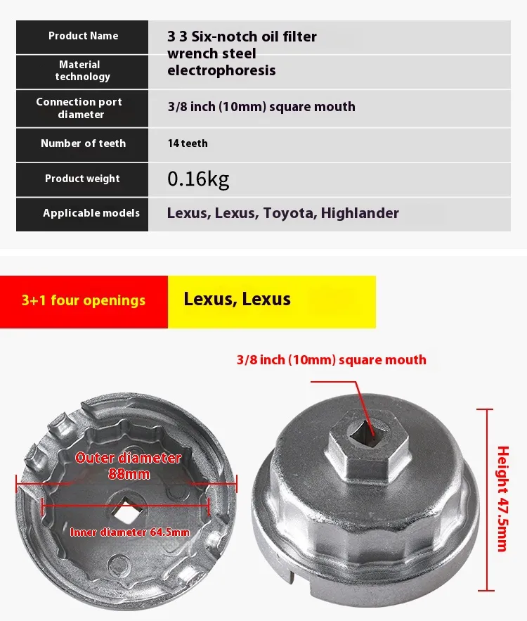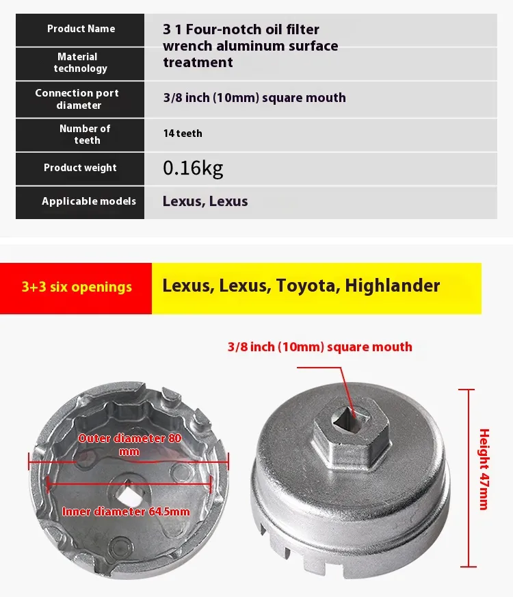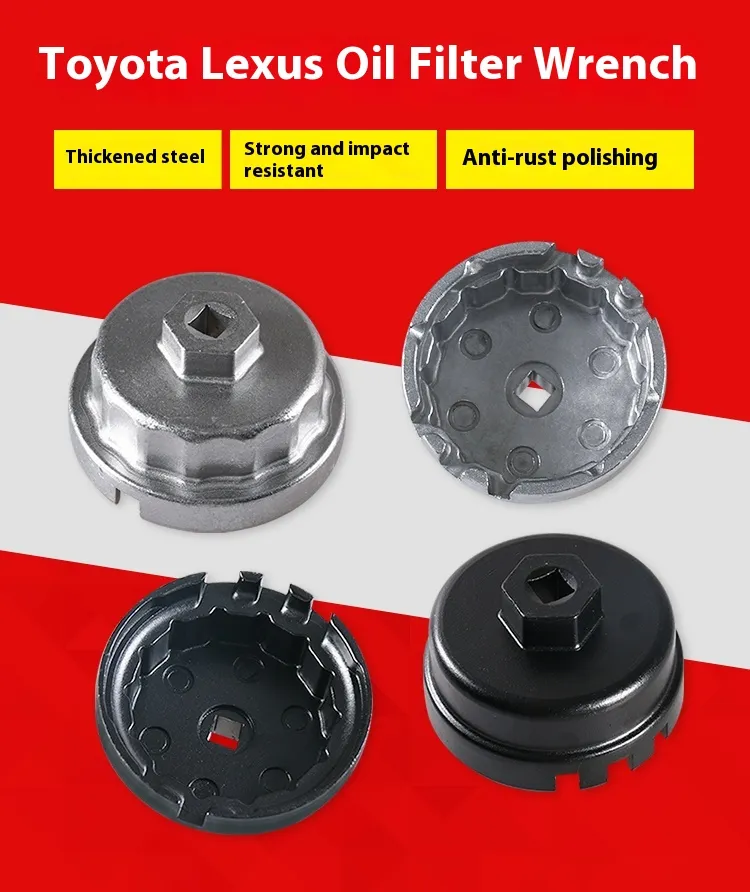 Easily remove stubborn engine oil filters with this universal aluminum removal tool. Designed for compatibility with a wide range of vehicles including Corolla and Lexus, this heavy-duty wrench provides a secure grip without damaging the filter or engine housing. Perfect for both DIY enthusiasts and professional mechanics.
