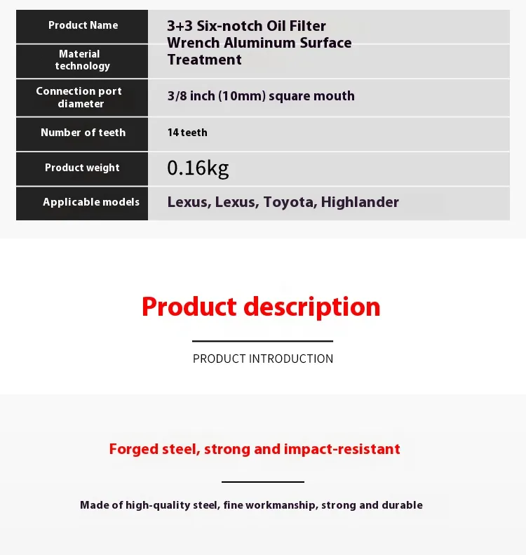 Crafted from premium aluminum alloy, the tool is lightweight yet exceptionally durable. Its adjustable design fits multiple filter sizes, while the ergonomic handle ensures maximum leverage and comfort during use. Smooth operation prevents slips, making oil filter changes faster, safer, and more efficient.